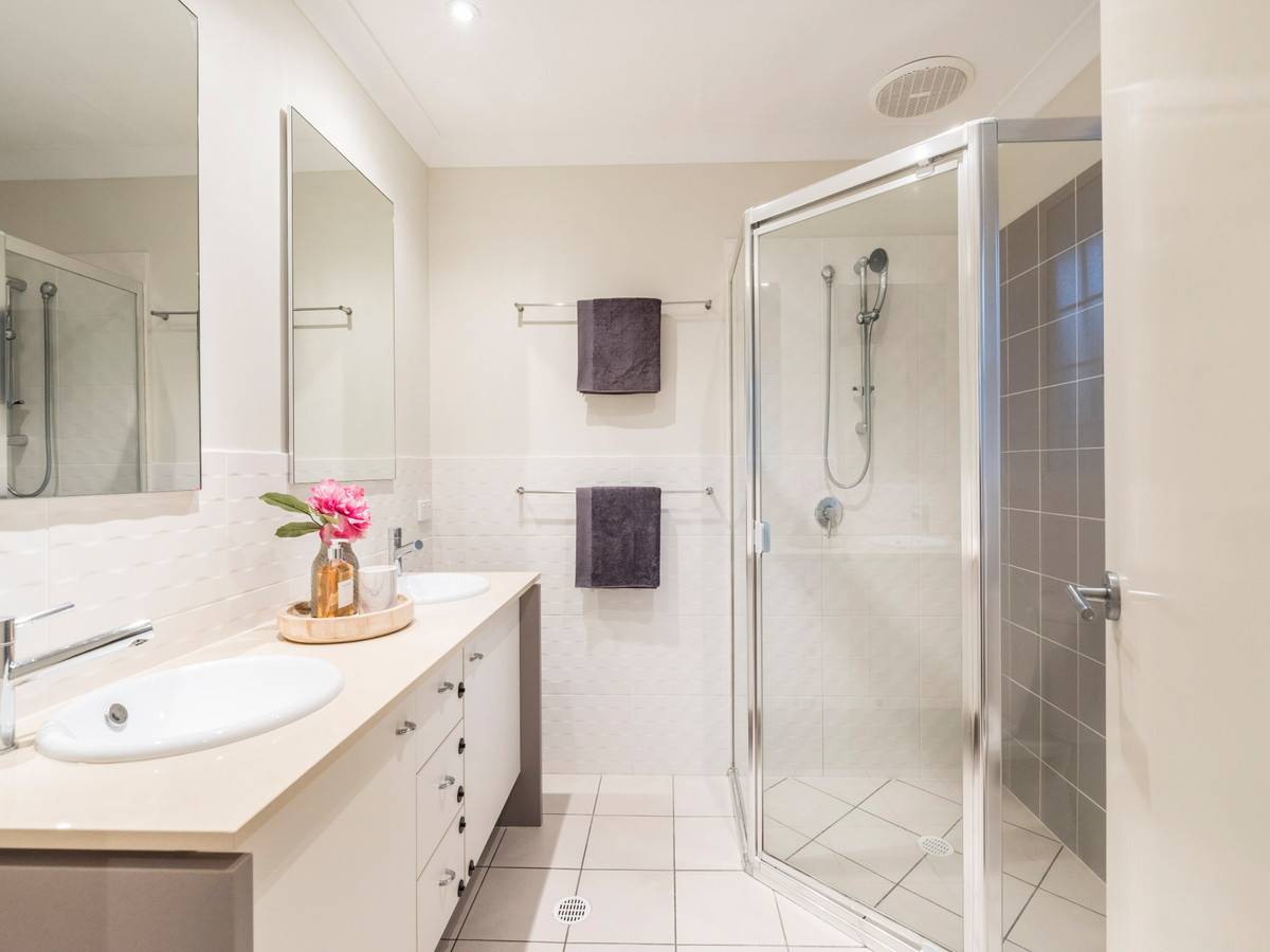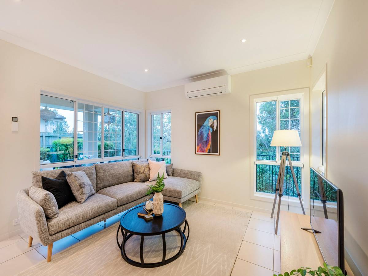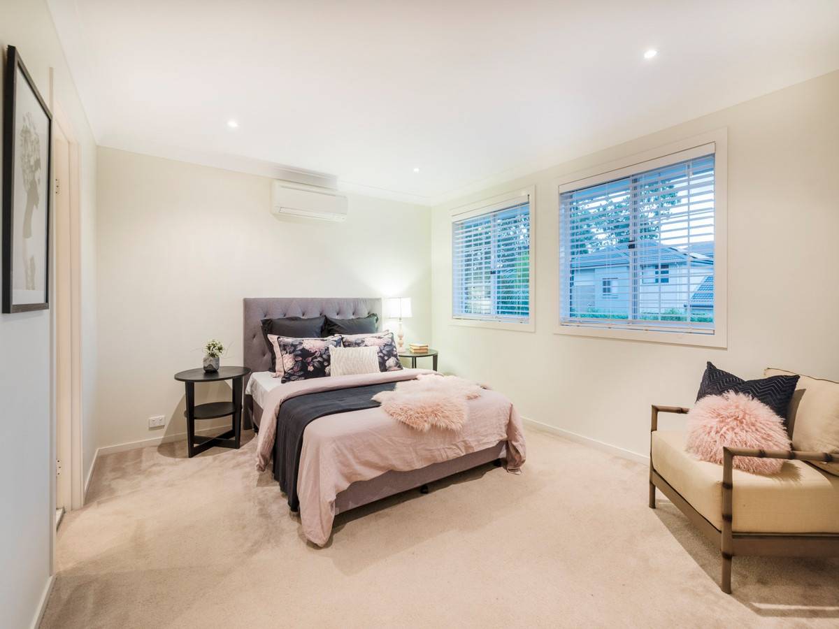 The upper level of the home is devoted to peaceful and private downtime, with four generously sized bedrooms including a master suite with walk-through robe, ensuite and double sink vanity. The other three bedrooms have air conditioning, plush carpet and built-in robes while one bedroom has private access to the balcony. A luxe main family bathroom services these bedrooms with separate shower, bath and toilet.