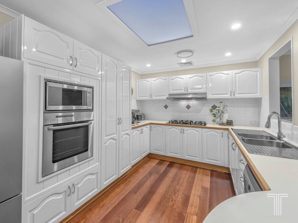 Flowing off the first living space, the dining area is very generously sized and easily accesses the sleek and stylish gourmet kitchen. Featuring a skylight, abundant white cabinetry, large benchtops, stainless steel appliances, 5 burner gas cooktop and breakfast bar, preparing meals here will be a delight.