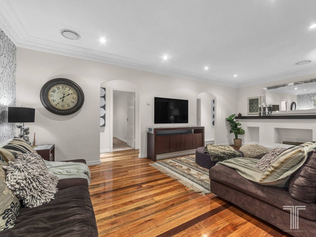 Set on 546m2 and spanning two levels, the upper floor of the residence serves as the heart of the home. Adorned with polished timber flooring, high ceilings and filled with natural light and cooling breezes, the living room also boasts downlights and ornamental cornicing.