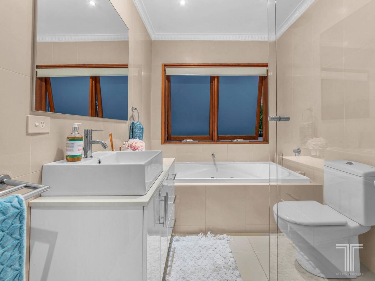 Servicing the home, the main bathroom is complete with shower, vanity, jetted spa bath and toilet.