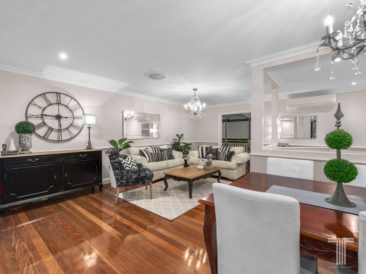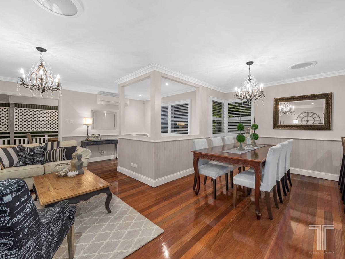 Privately set behind a white picket fence and established gardens, enter onto the upper level and admire the shiny timber floors, half VJ walls and sparkling chandelier that adorn the living and dining area. Dressed with a neutral colour scheme and modernised with downlights throughout, this spacious and inviting open plan living space spills out via double doors to the large entertainers deck.