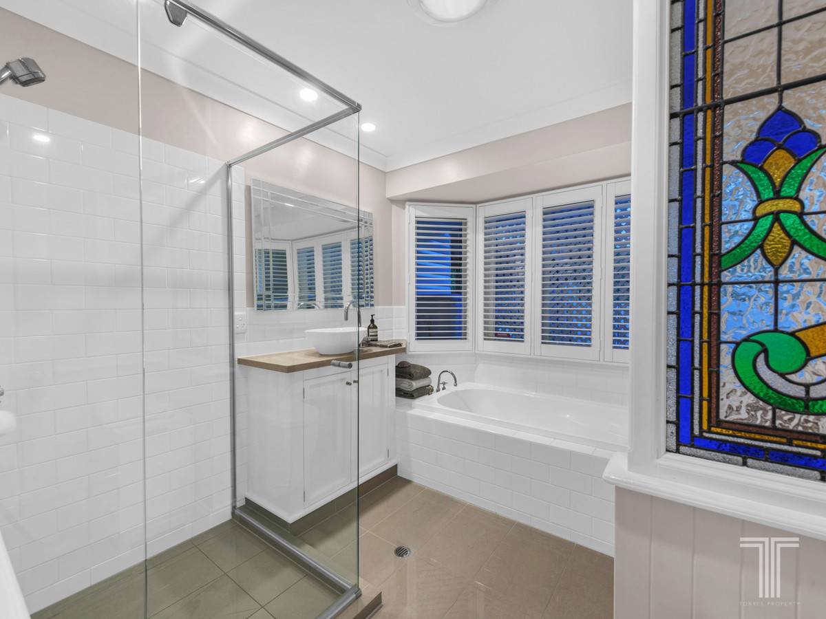 Enjoying stunning stained glass windows and plantation shutters, the main bathroom is very well sized and boasts a shower, separate bath, stone top vanity and toilet.