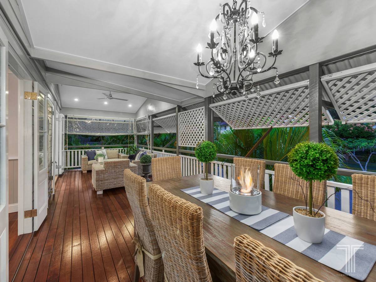 Generously sized to cater for both an outdoor lounge and dining suite, this outdoor retreat is perfect for hosting guests and features a ceiling fan, chandelier and retractable lattice screens for privacy.