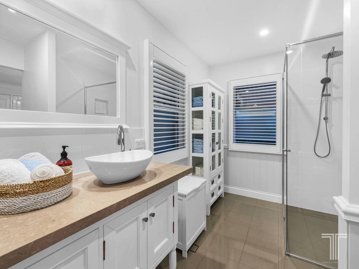 A private retreat with direct access onto the deck, the master suite boasts built-in robes, air-conditioning and modern ensuite with stone benchtops, dual vanities, plantation shutters and large shower.