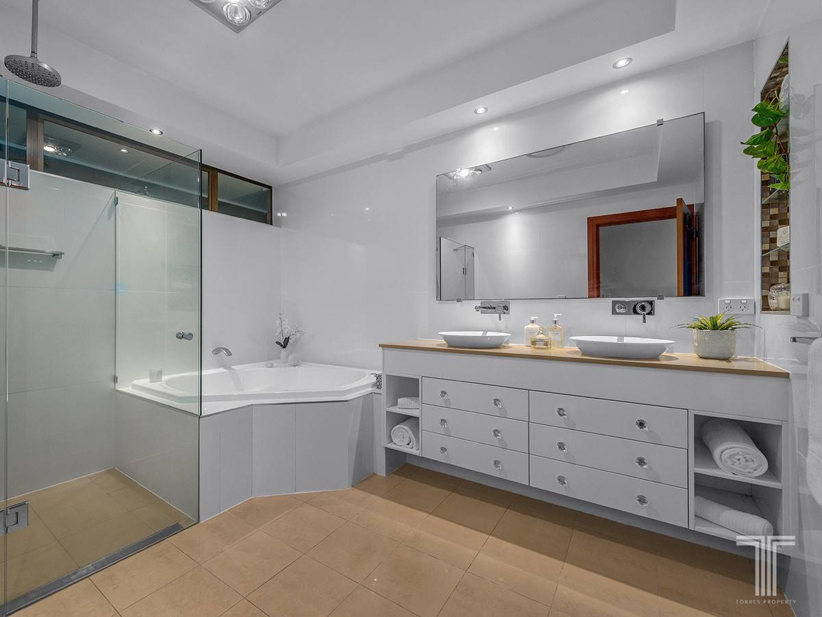 Main bathroom with spa bath, shower, dual vanities and separate toilet