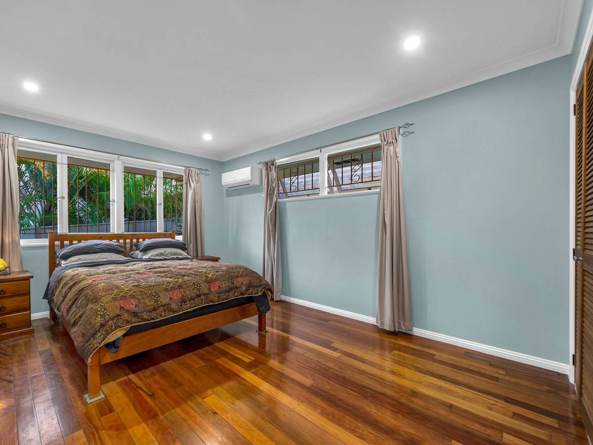 Entering inside, you are greeted by the lounge room with polished timber flooring. Filled with natural light via wall-length glass doors, this comfortable and air-conditioned living space flows out with ease to the entertainers balcony. Perfect for sitting, dining or simply enjoying spectacular sunsets, this elevated retreat captures stunning panoramas over leafy Holland Park to the city skyline, Mt Cootha and beyond.