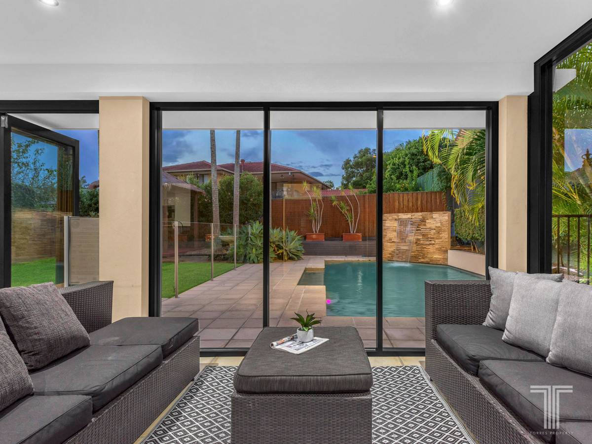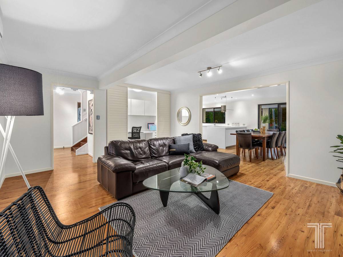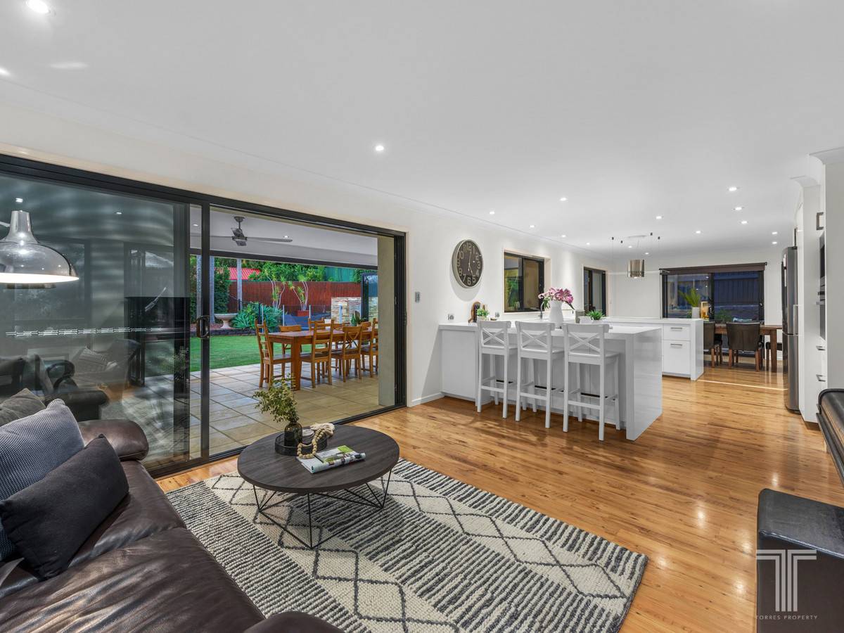 Overlooking the rear enclosed patio through sliding glass doors, the informal lounge and dining areas are awash with natural light. Framing the designer kitchen, this central position perfectly connects these lively living spaces and caters to effortless indoor/outdoor entertaining.