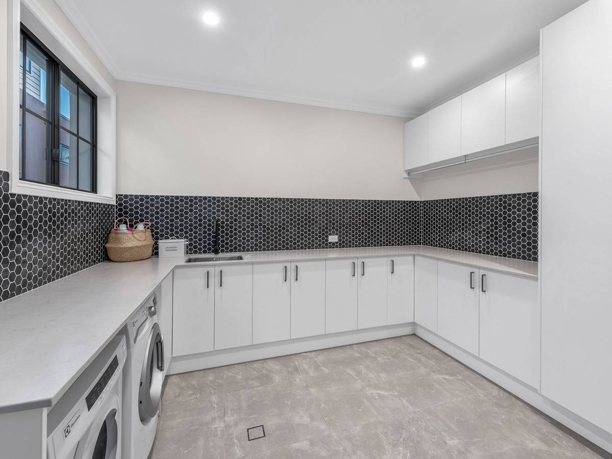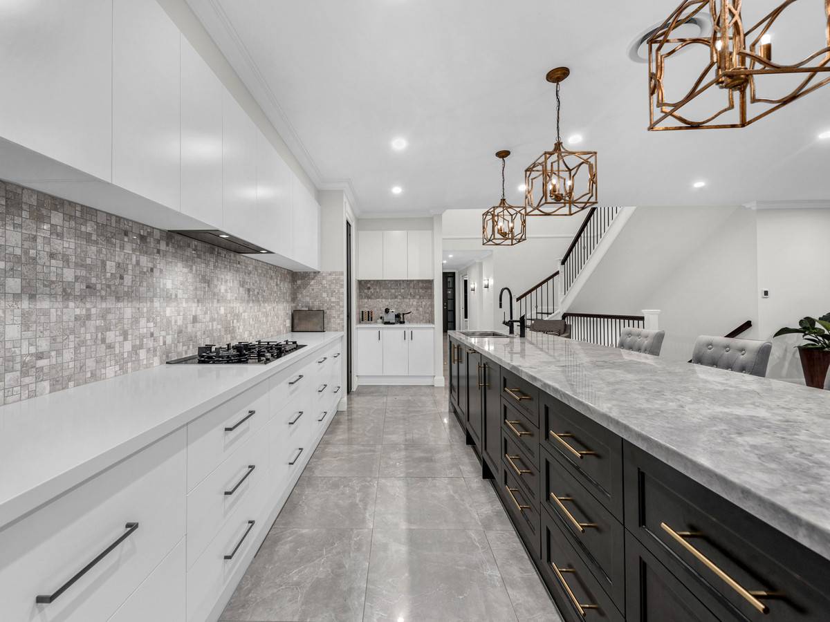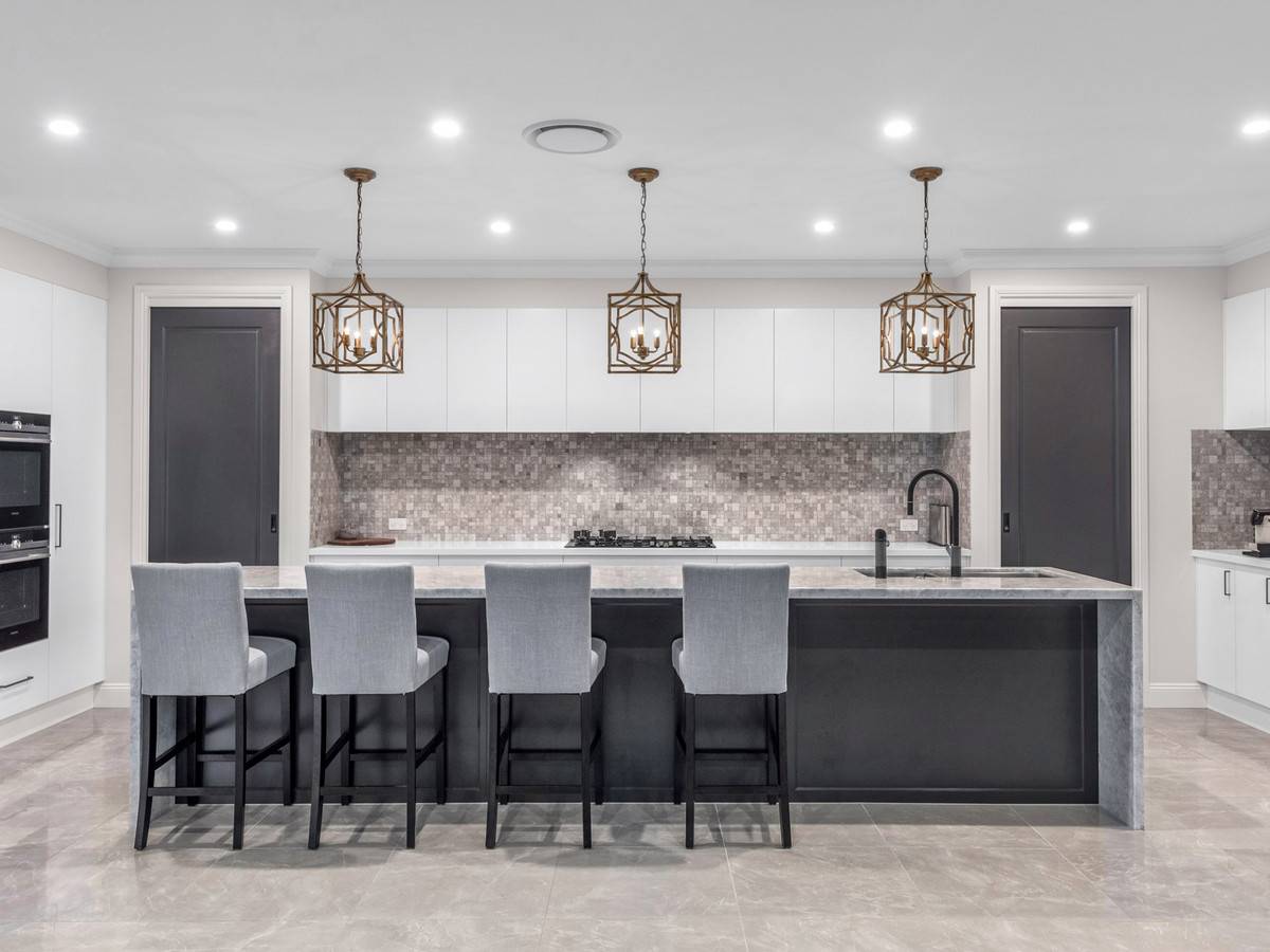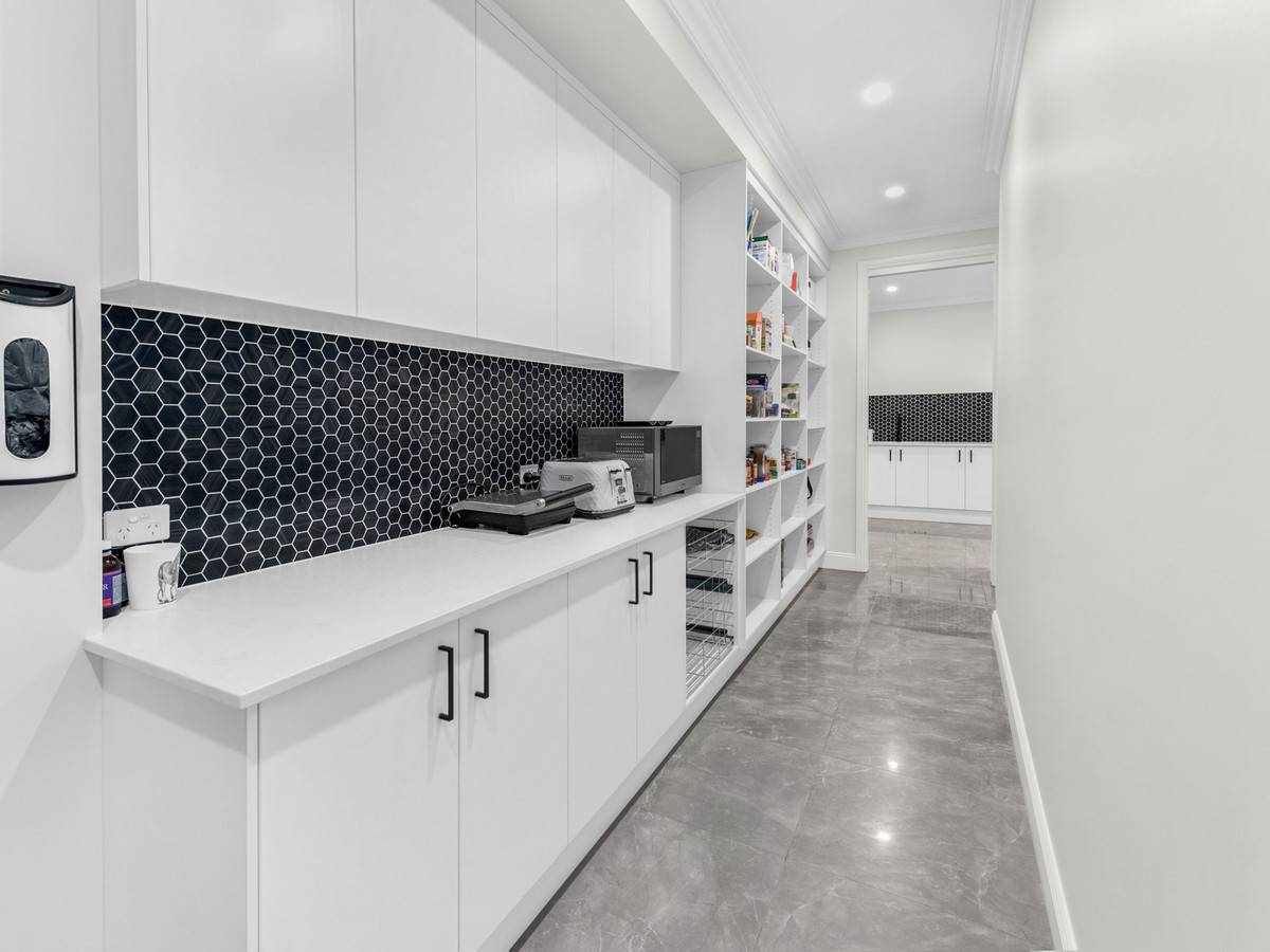 Framed by wall length glass sliders to create a seamless transition out onto the alfresco entertaining area, the dining rooms adjoins the culinary kitchen with state-of-the-art finishes. A designer showpiece and elegantly constructed, this gourmet haven is adorned with a 4m waterfall White Princess granite breakfast bar, full suite of European appliances, two pyrolytic ovens, 5 burner gas cooktop, 2Pac soft close cabinetry, feature pendant lighting, Zip Hydrotap and full-size butlers pantry which is destined to impress.
