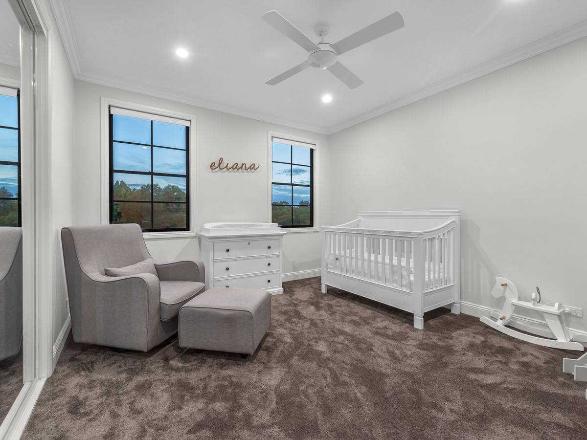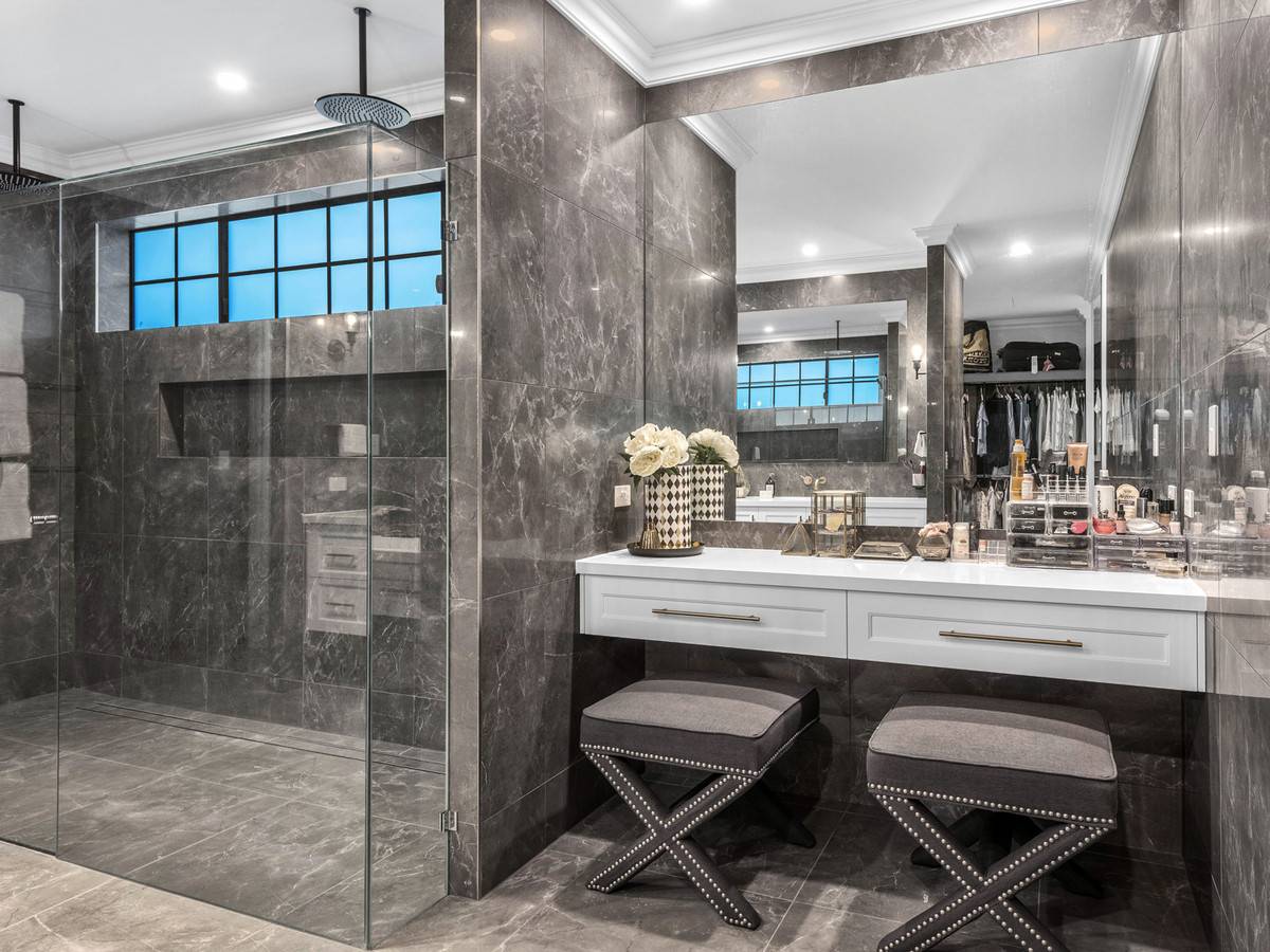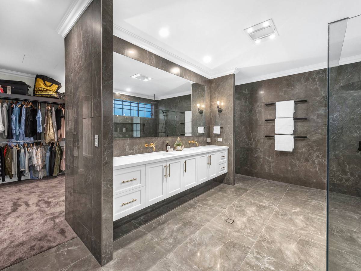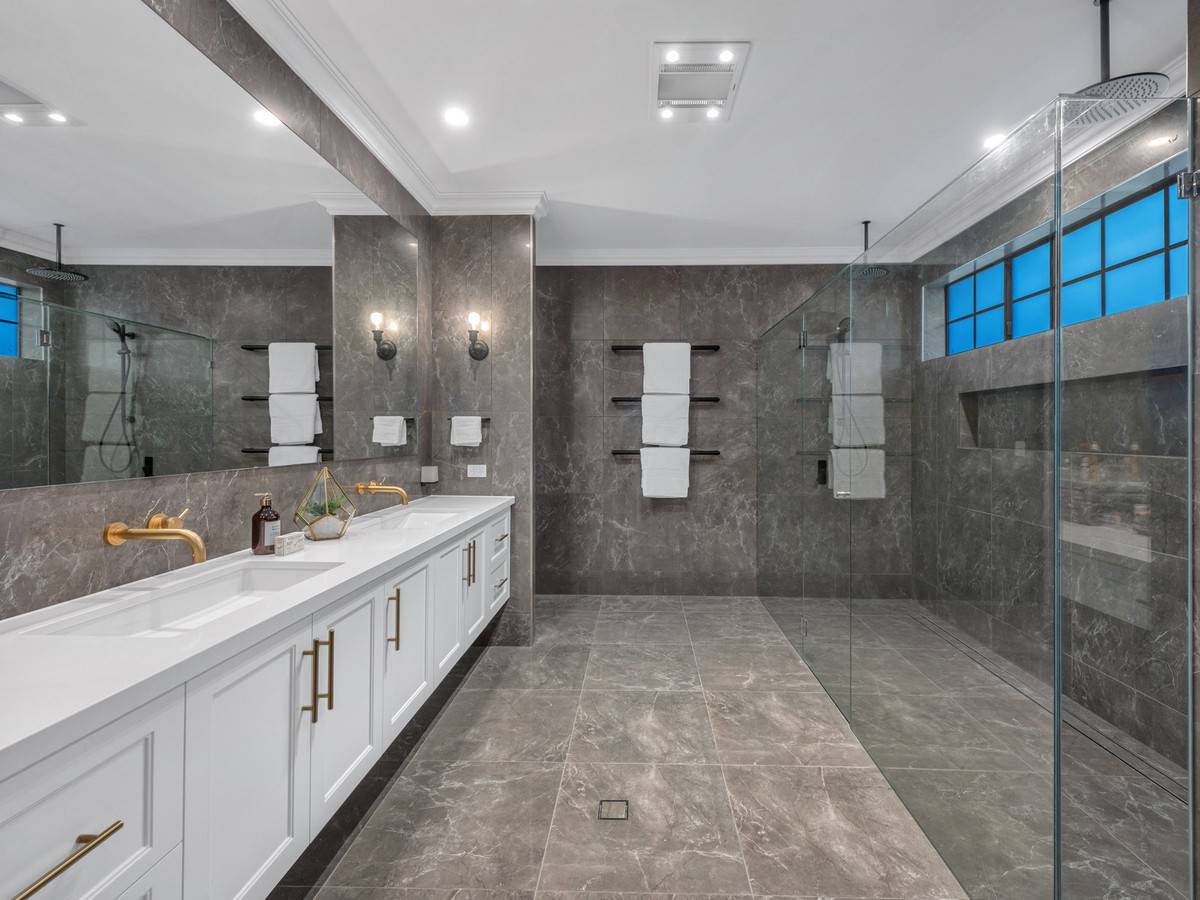 Upstairs, four spacious bedrooms are well separated from the main living level below. An idyllic and opulent retreat, the master suite is a parents paradise and features a private balcony, walk-in robe with dressing area and luxe ensuite with dual vanities, feature stone benchtops and dual headed shower.