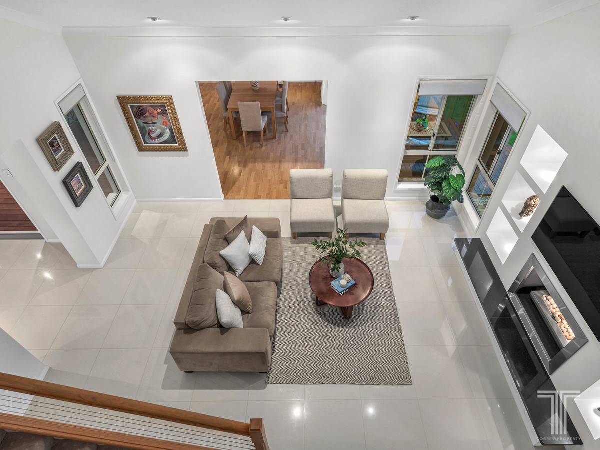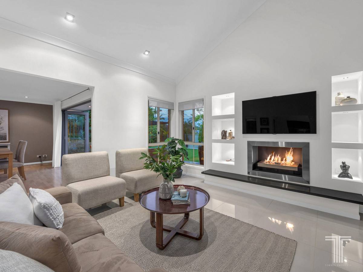 Open plan, the inviting living room with beautiful floor tiles features a soaring void to bring in a wealth of natural light. Intimate and with a warming fireplace, this central living space flows effortlessly into the formal dining room with glossed oak timber flooring and dual banks of bi-fold doors which extend out to two outdoor entertaining areas.