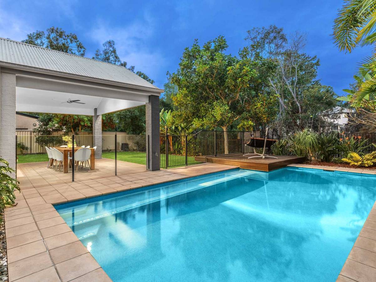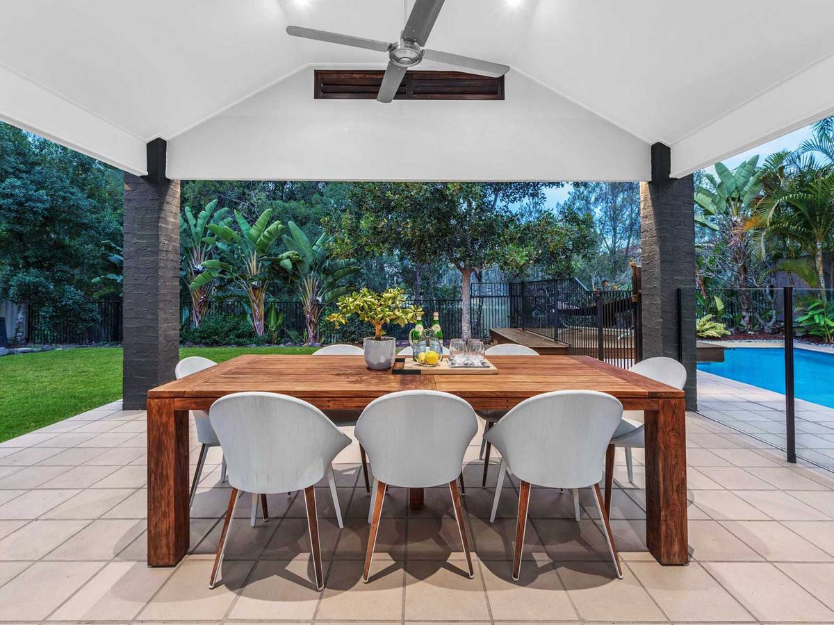 A tropical hideaway, the covered entertainers terrace overlooks the lush backyard, sparkling saltwater pool with timber deck and rows of palm trees creating privacy around this outdoor haven.