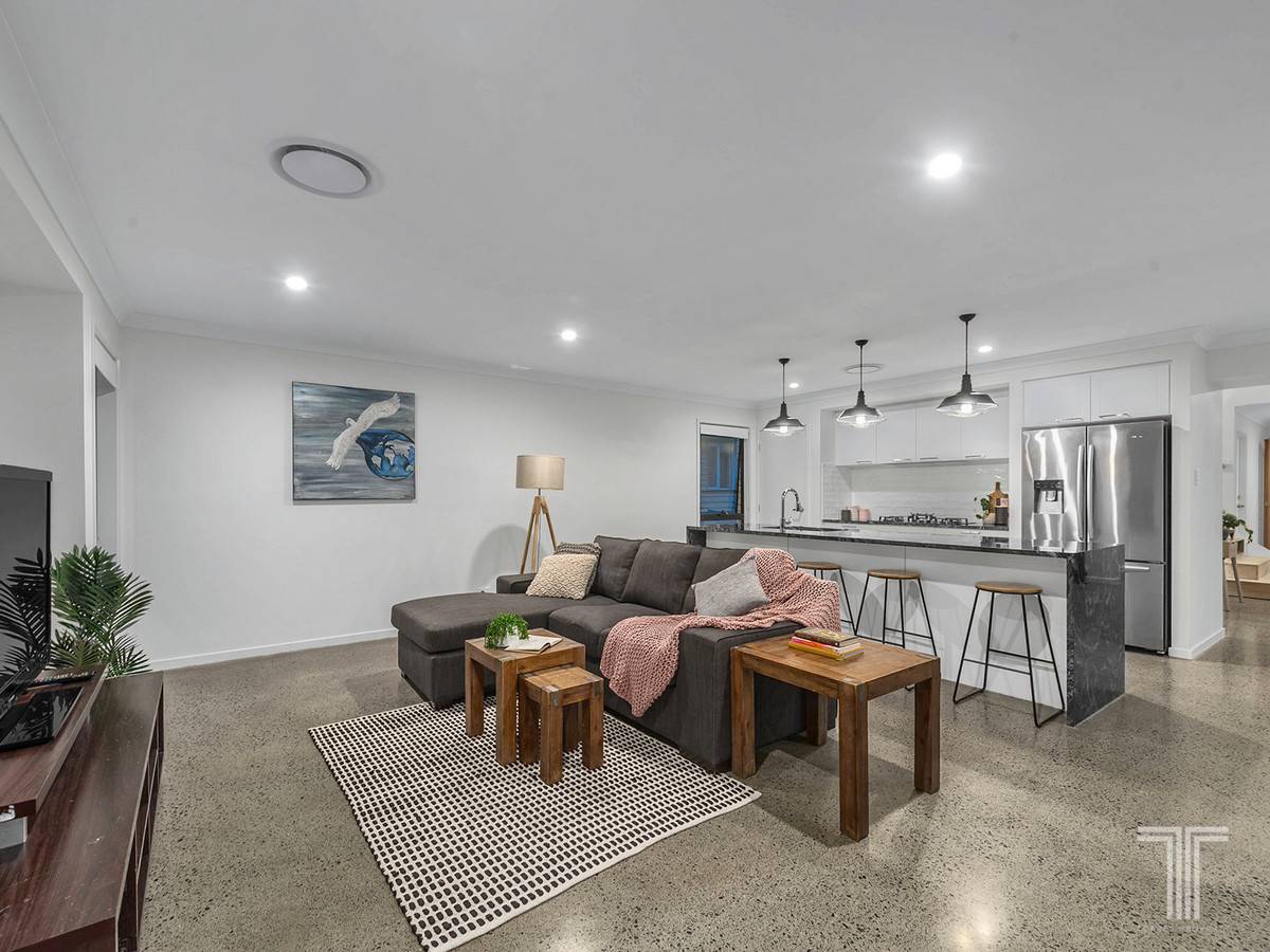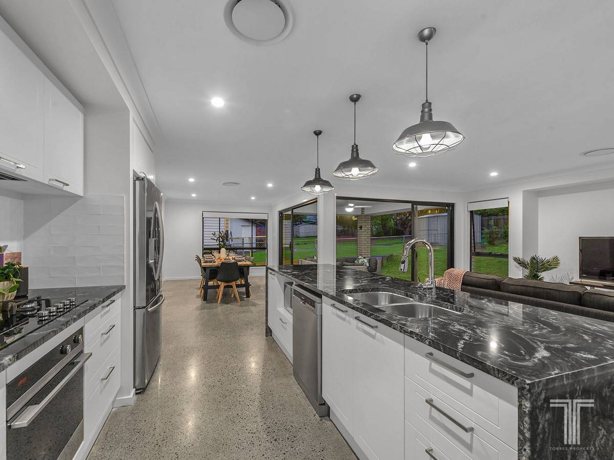 Open plan, the relaxed and stylish lounge and dining area adjoins the sleek and sophisticated kitchen adorned with Indian mist granite benchtops, 5 burner gas stove, quality stainless steel appliances, walk-in pantry and feature pendant lights.