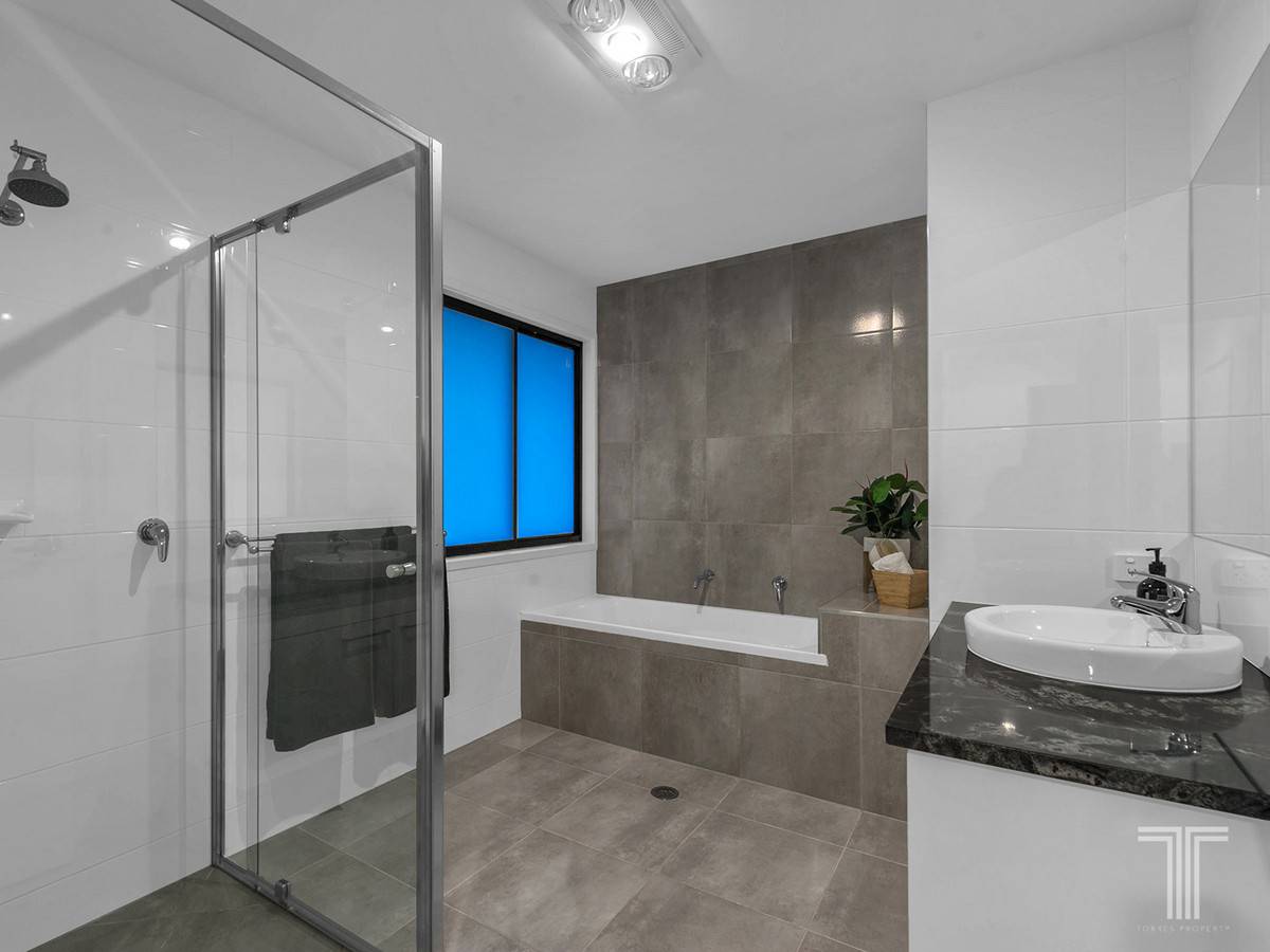 Main bathroom with bath, shower, granite benchtops and separate toilet
