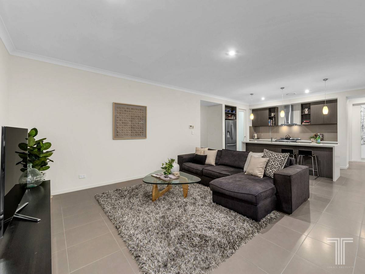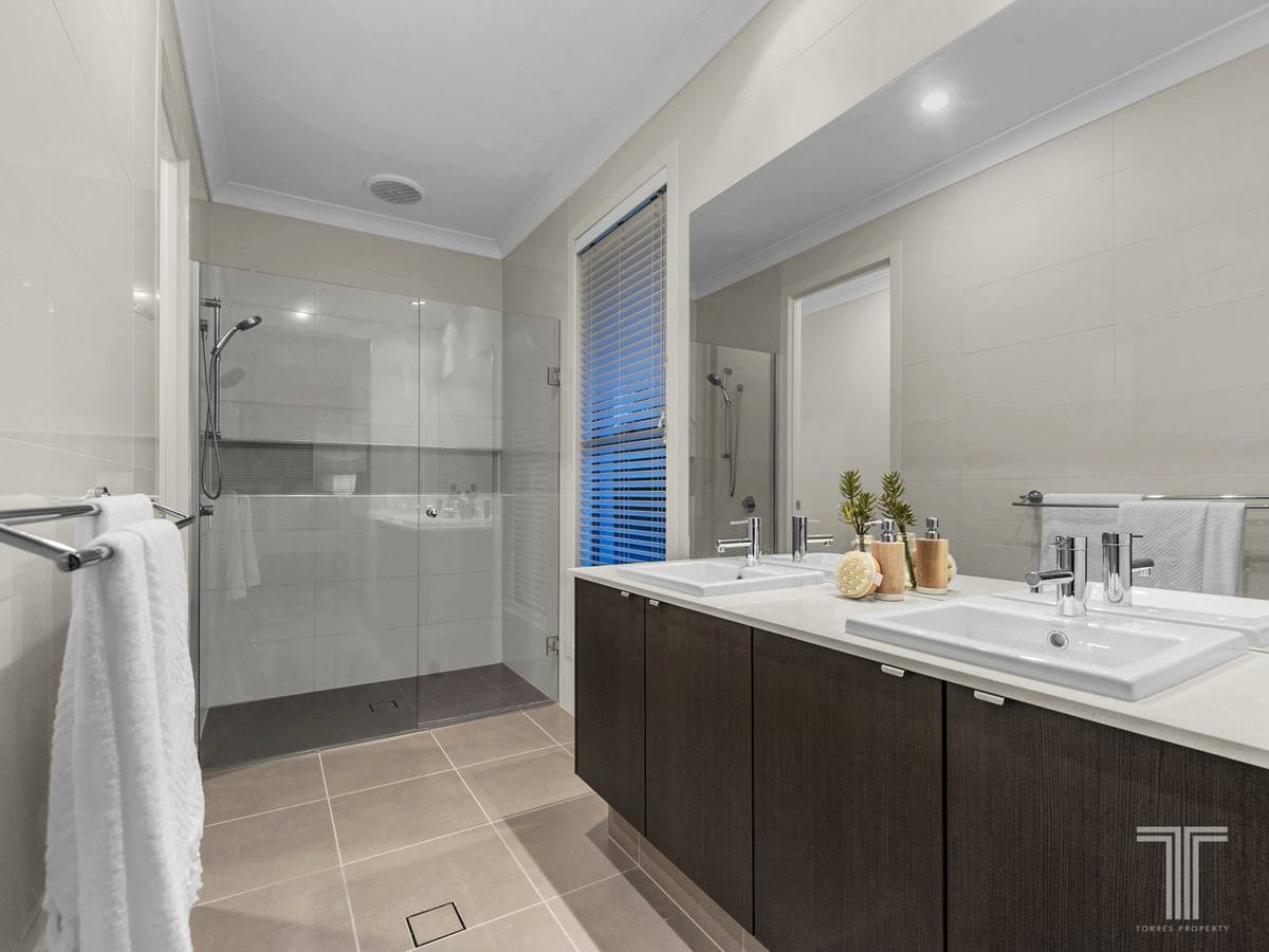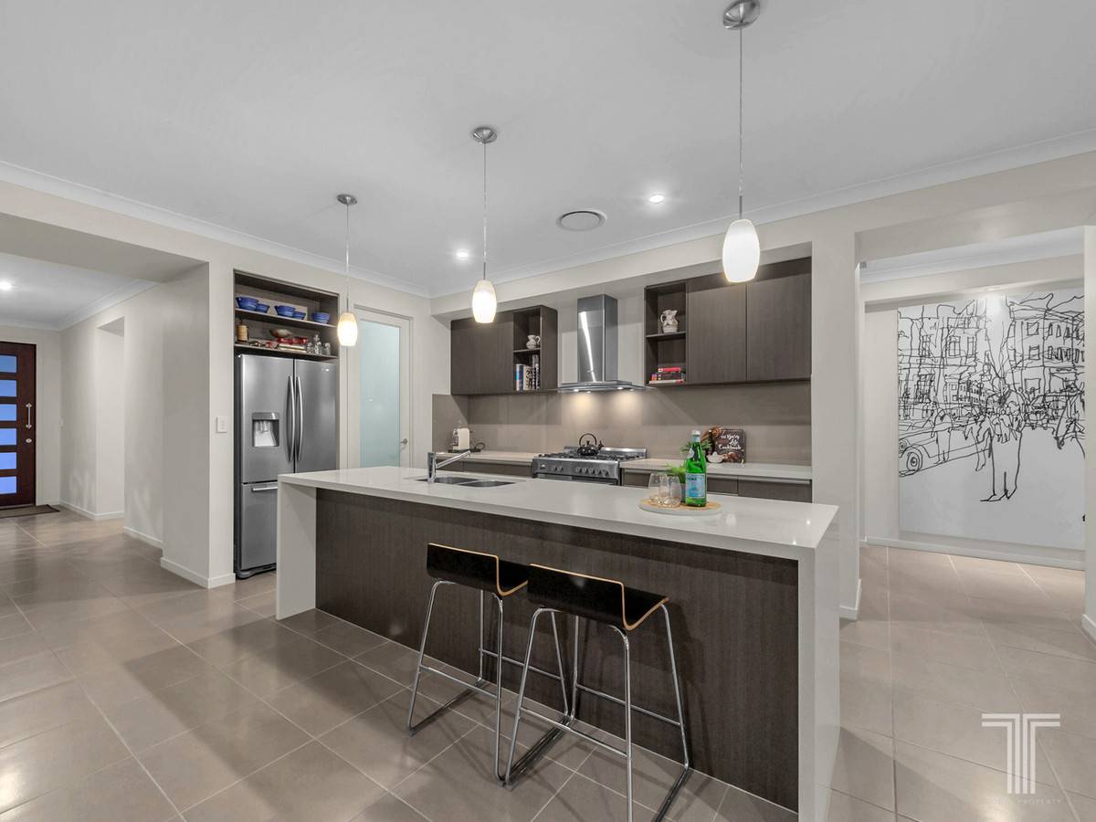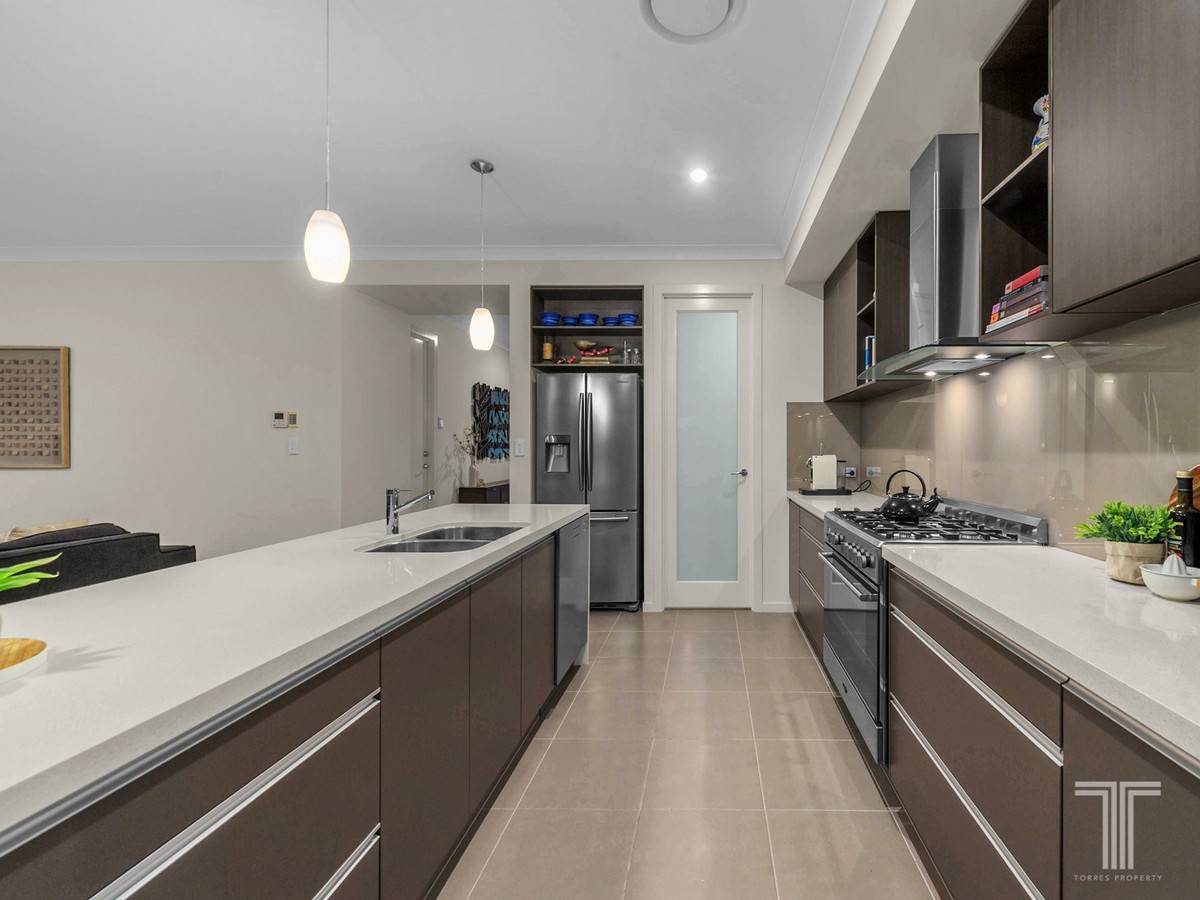 Beyond the statement front door is a bright and functional open plan design which invites creative flair with soft lighting, neutral tones and large modern tiles. A spacious kitchen contributes subtle elegance to this space with Baumatic 900mm stove with gas cooktop, Technika rangehood, dishwasher, stone waterfall benchtops with contrasting timber style cabinetry, dual sink, plus an abundance of storage space including an outstanding pantry.