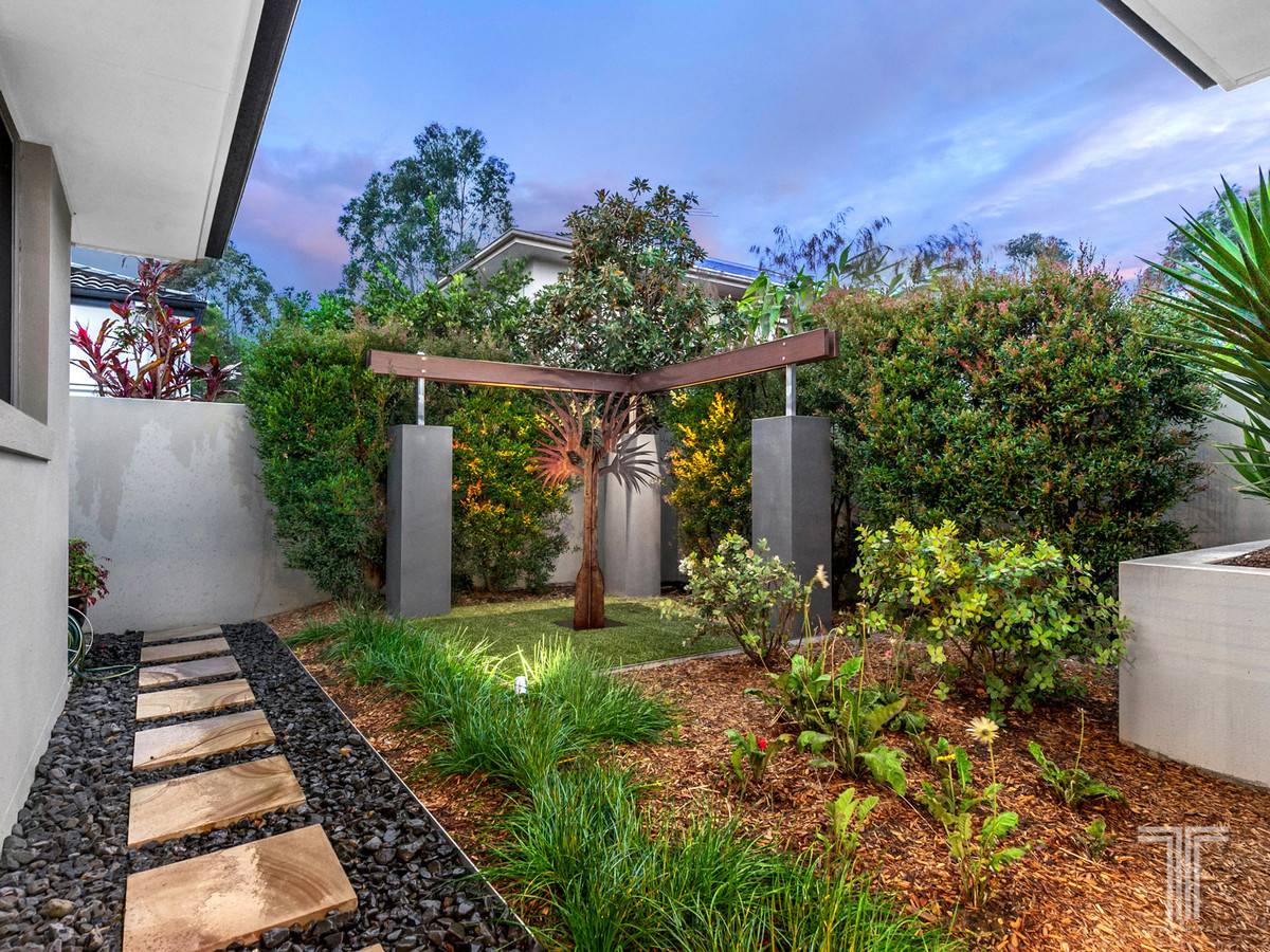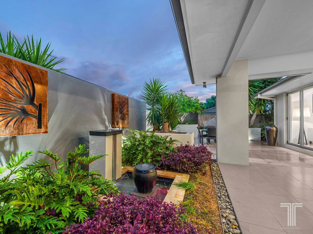 The kitchen overlooks the roomy lounge and entertainment areas, with plenty of space for a pool table, or another informal living spot. Sliding glass doors at the edge of the living area work to diminish the boundary between inside and out, allowing a seamless alfresco transition. When friends and family come to call, an additional open-air outdoor dining area awaits, surrounded by lush garden trimmings and plants. A tranquil zen garden frames the rear of the property and is an ideal place to take a few moments for yourself.