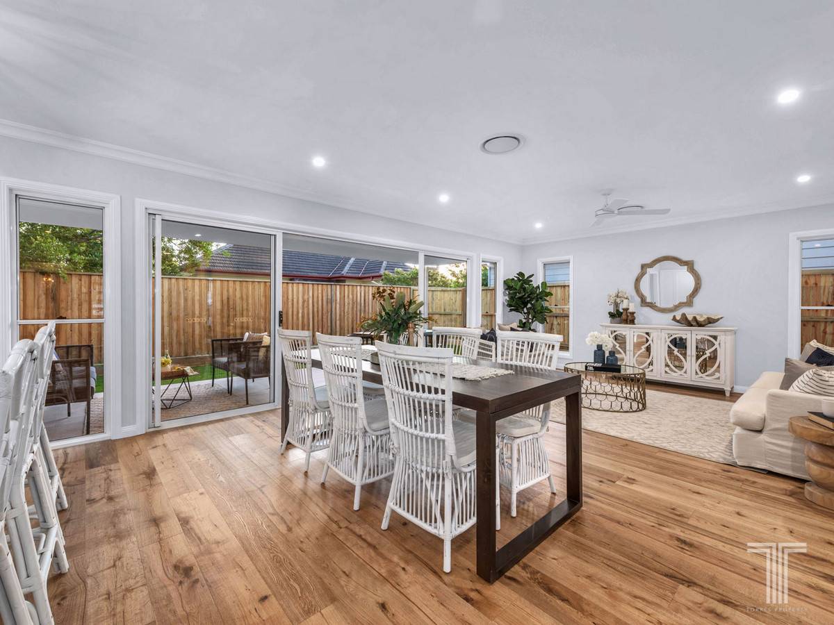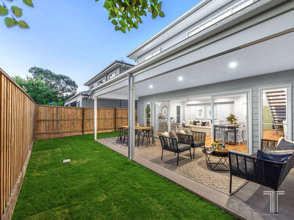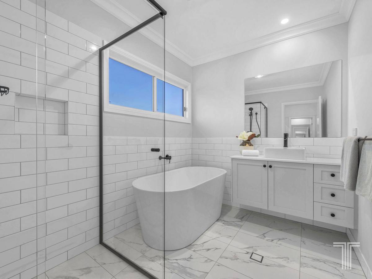 A further three bedrooms on this floor all include mirrored built-in robes and are serviced by the modern main bathroom with matte black tapware, deep bath and separate powder room. A fifth bedroom and third two-way bathroom are positioned downstairs, ideal for grandparents and guests.