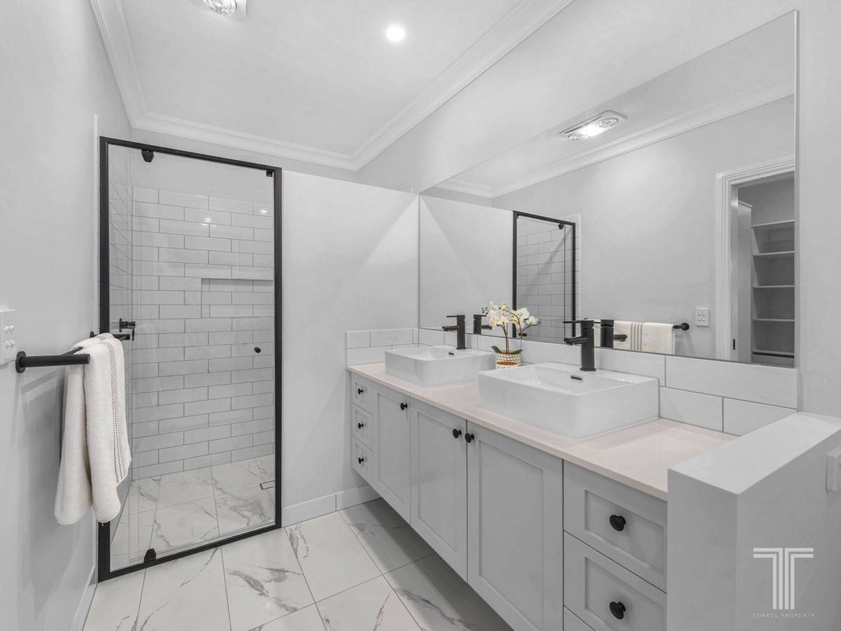 On the upper level, a large TV area accompanies four of the homes five bedrooms. A lavish retreat, the stylish, north facing master suite features striking French doors leading onto a private balcony and drawing in natural light. Also enjoying a walk-in robe and modern ensuite, the bathroom is designed with dual vanities, large shower, matte black finishes and marble look tiling.