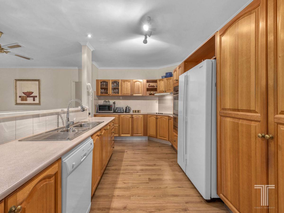 Ideal for more relaxed living, the casual meals and family room extends outside via sliding doors and adjoins the central kitchen featuring ample bench space, breakfast bar, timber cabinetry, Electrolux dishwasher, double wall oven and CHEF induction cooktop.
