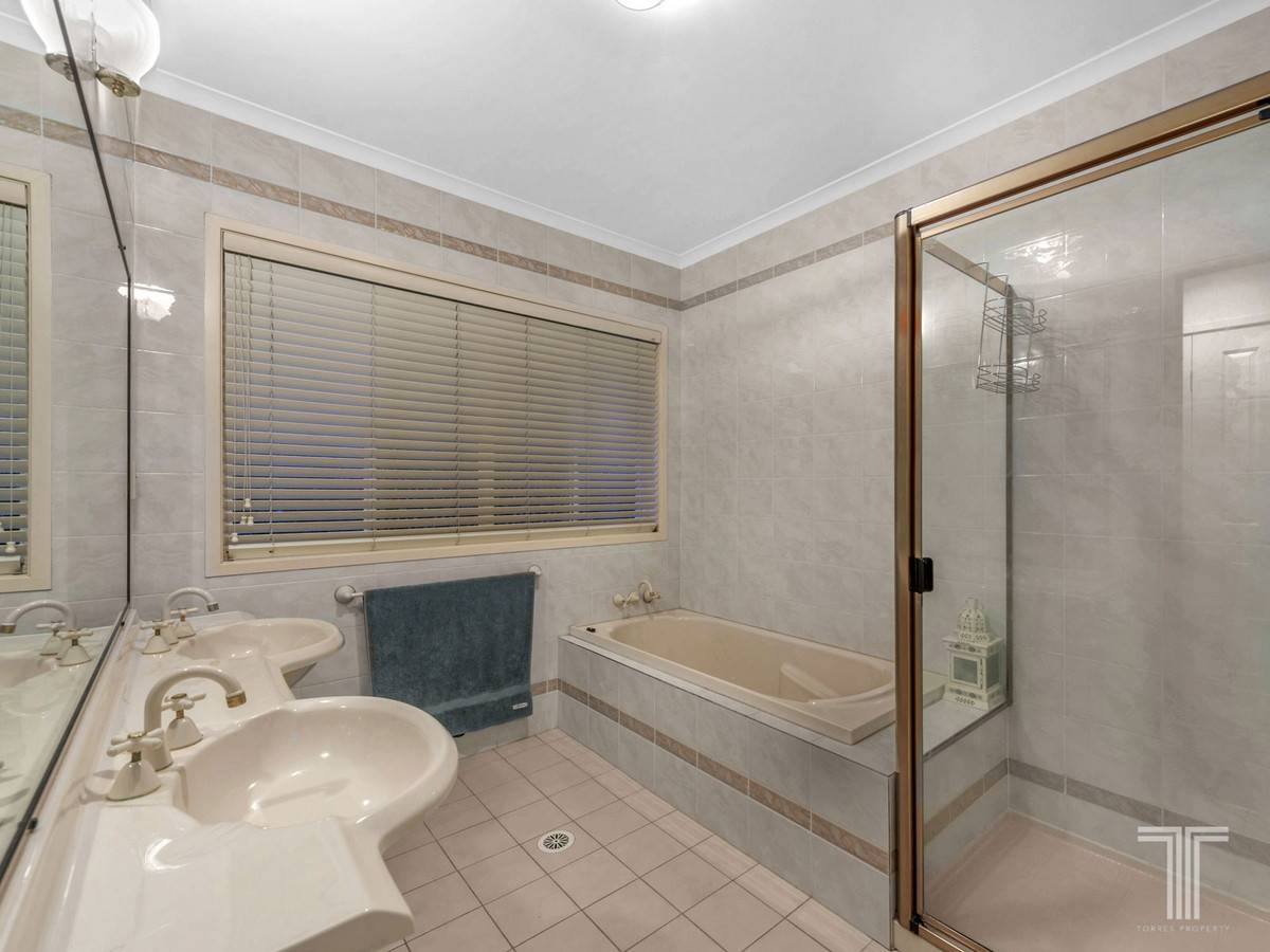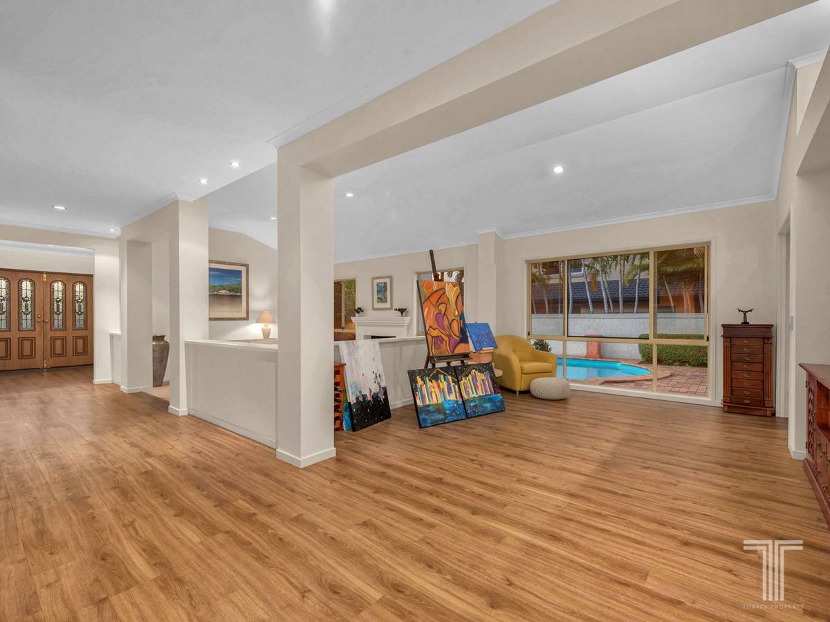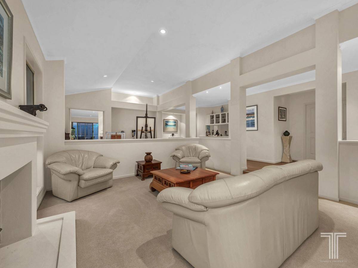 Framed by charming manicured gardens and designed with peace and privacy in mind, the home greets you with a spacious formal lounge. Boasting plush carpeting, high ceilings and cosy fireplace, this lounge is positioned next to the formal dining room which features polished timber flooring and views over the pool.