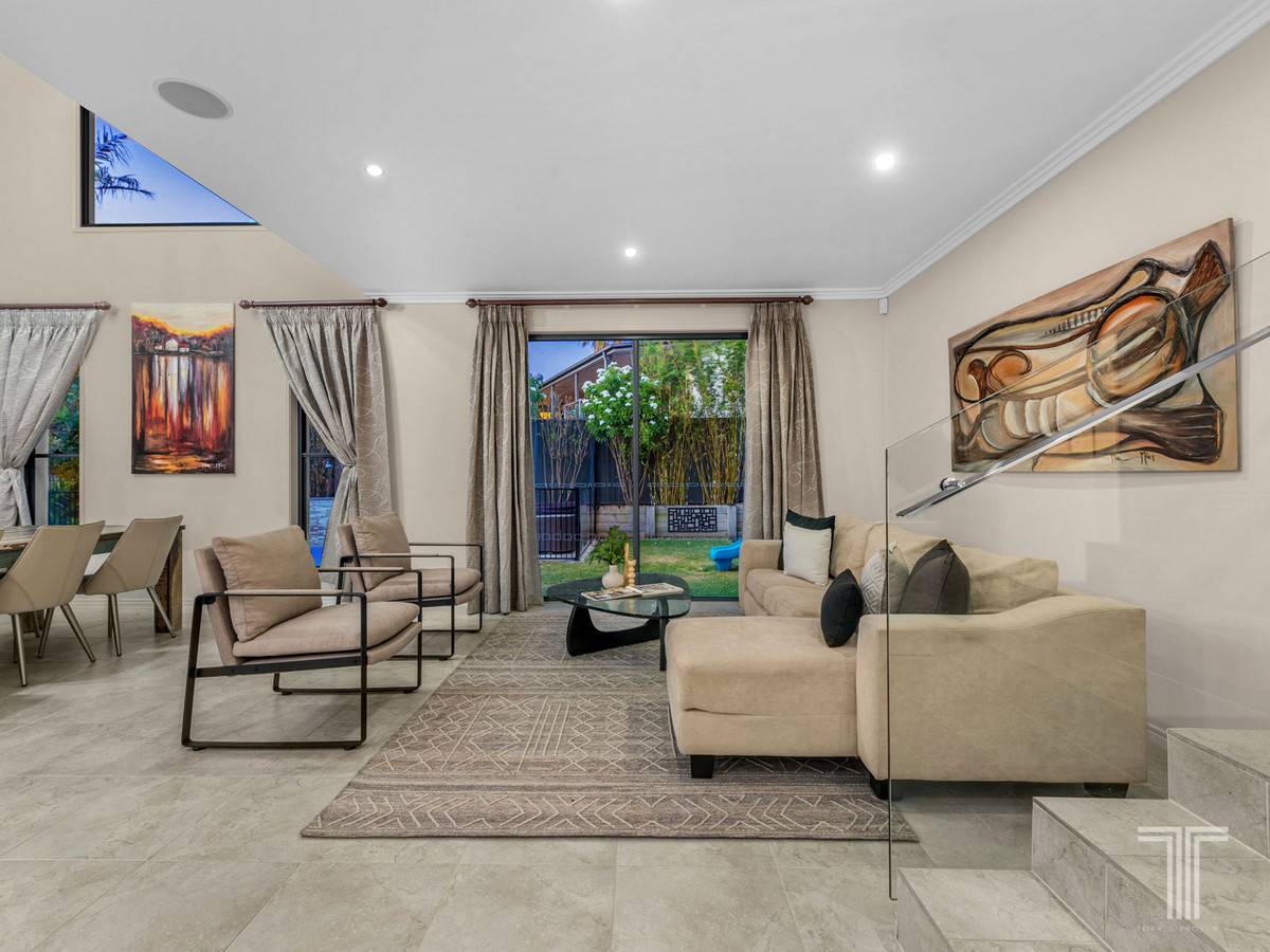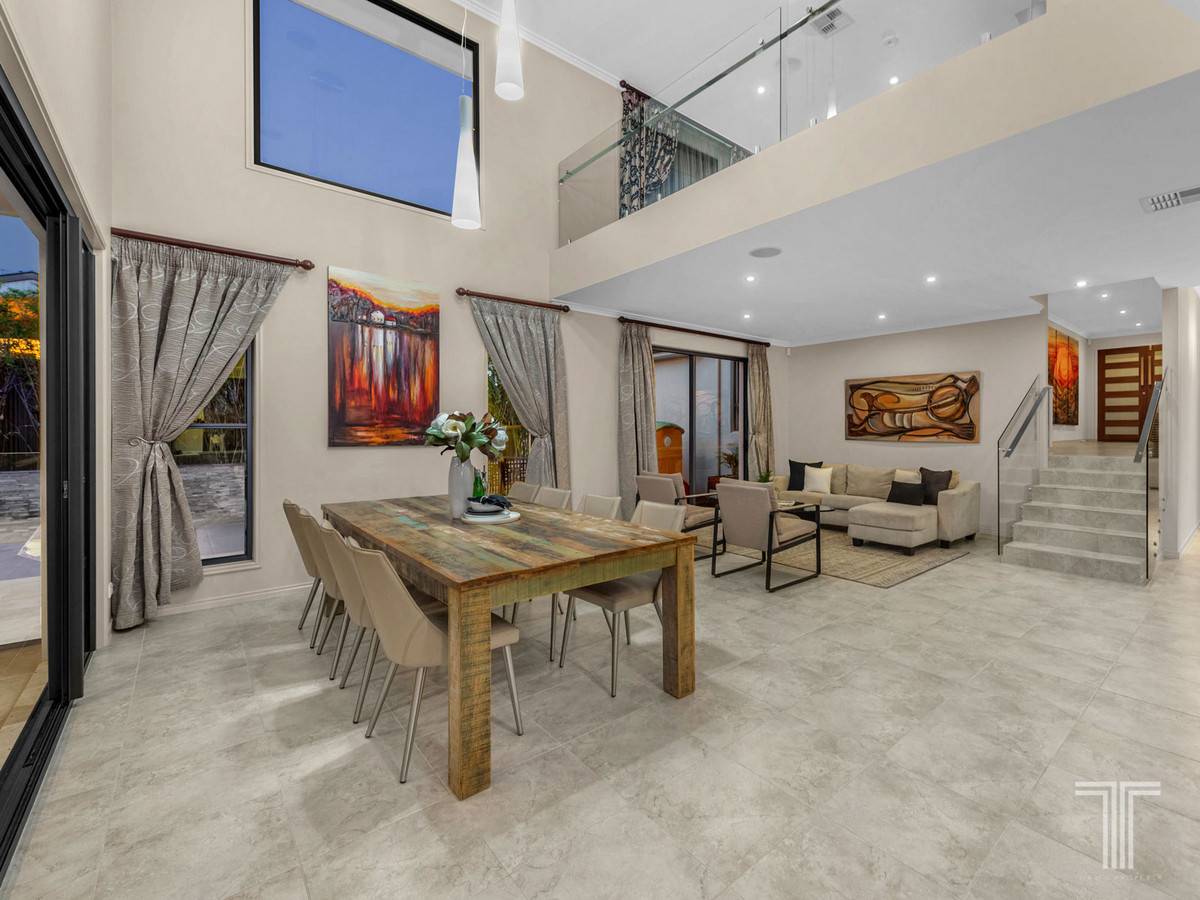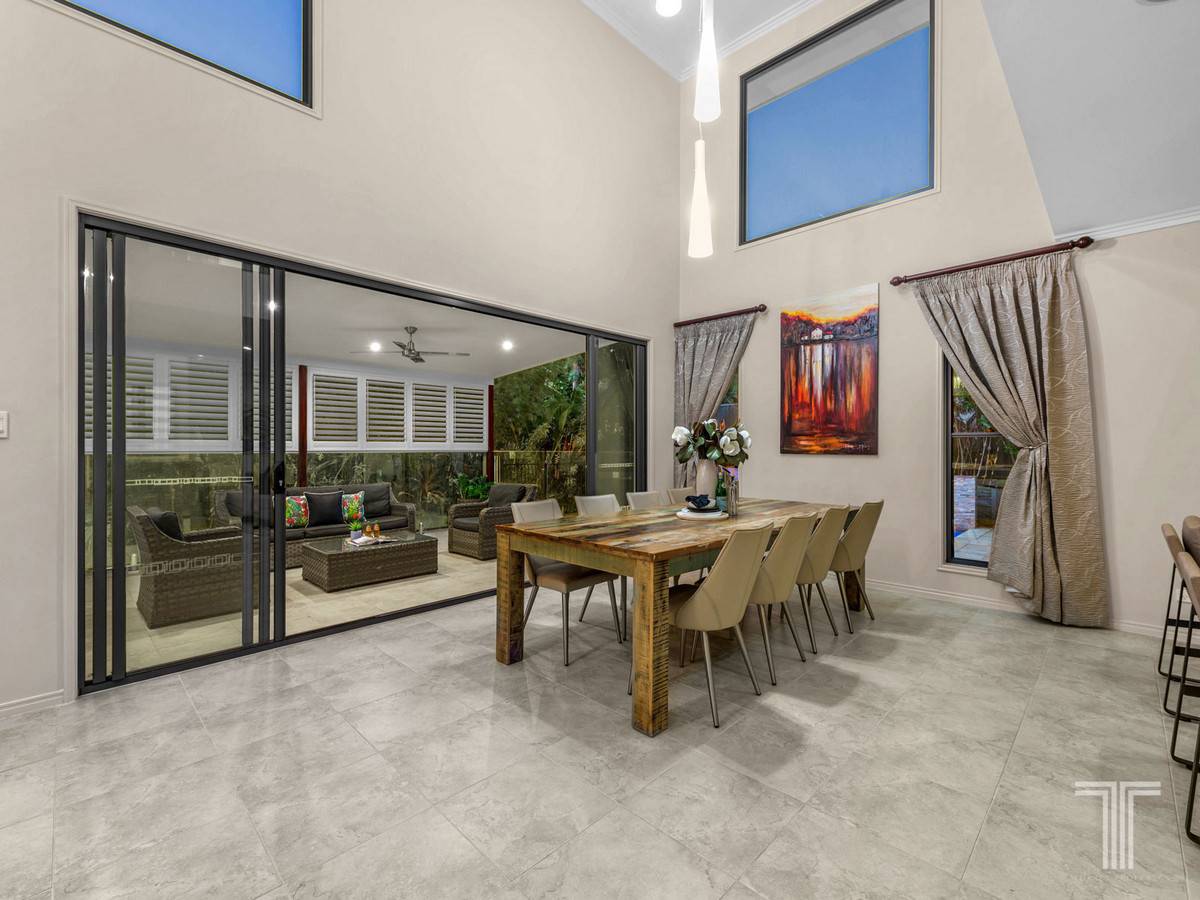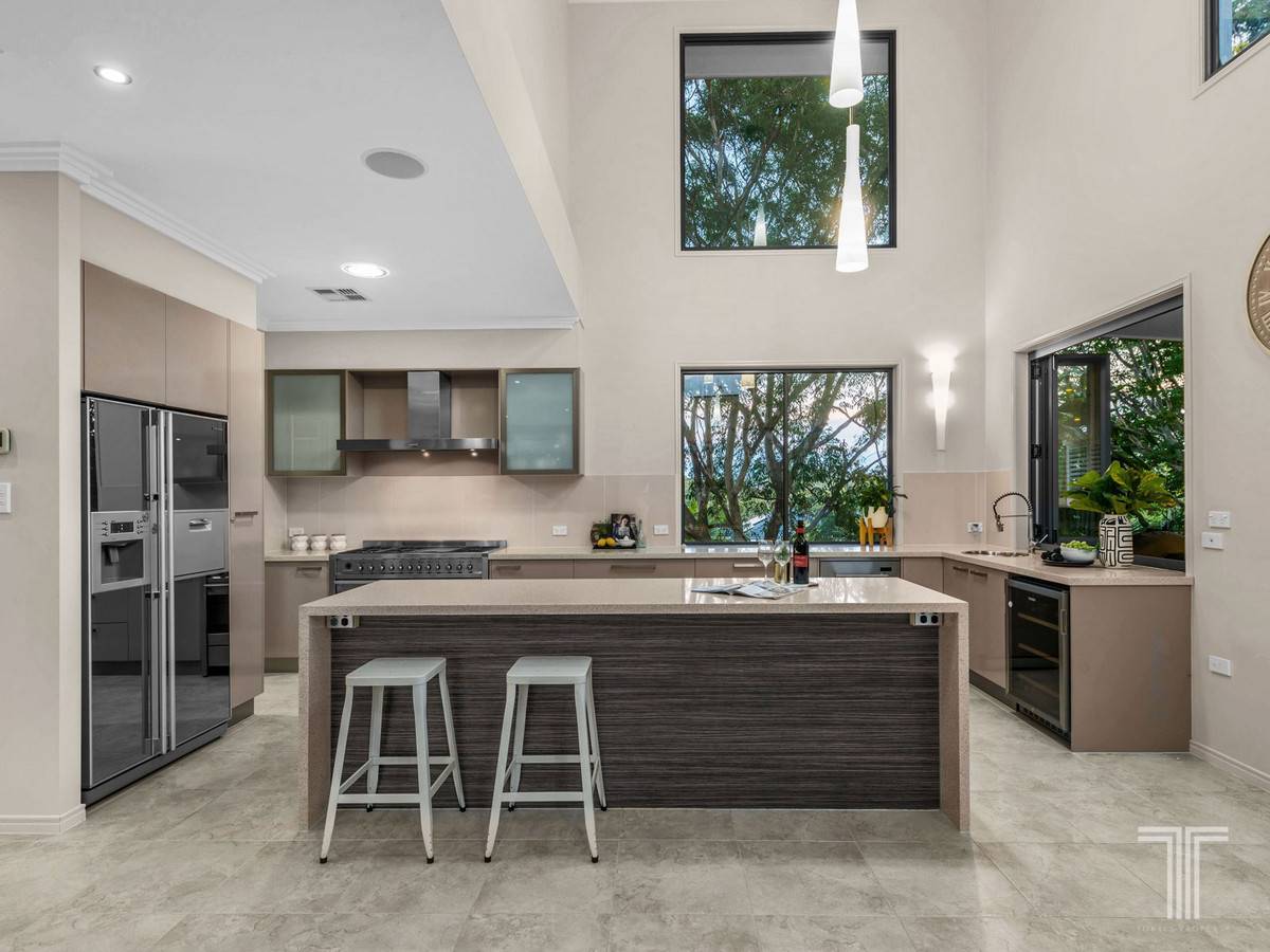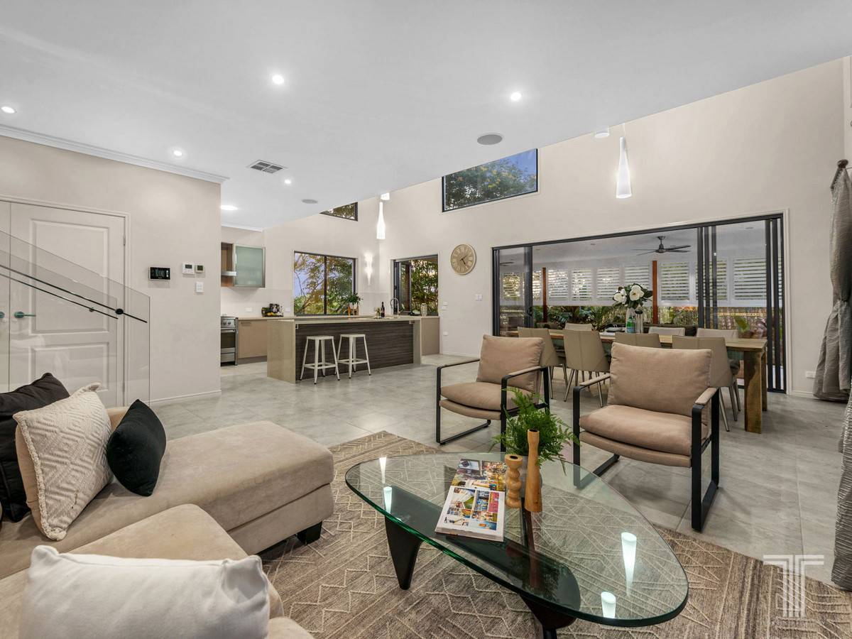Showcasing a soaring 5.5m void bringing in a wealth of light and sense of openness, this relaxed living space adjoins the gourmet chefs kitchen boasting 40mm Caesarstone benchtops, stainless steel appliances, island bench, bar fridge, walk-in pantry and servery window to the outdoor alfresco area. Framed by tropical greenery and overlooking the sparkling pool, this outdoor retreat seamlessly connects inside.
