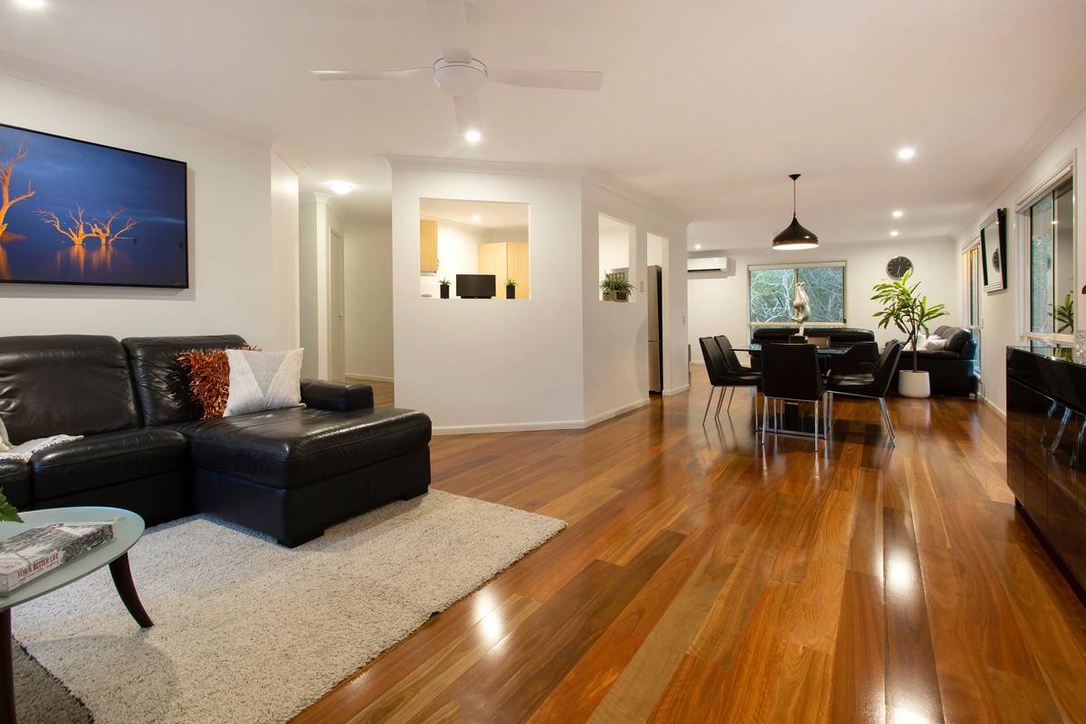 Spanning a single level of low maintenance living, the home reveals an open plan lounge and dining area and second living space. Adorned with polished timber flooring, air-conditioning and filled with natural light, this central space extends out seamlessly onto your expansive entertainers deck.