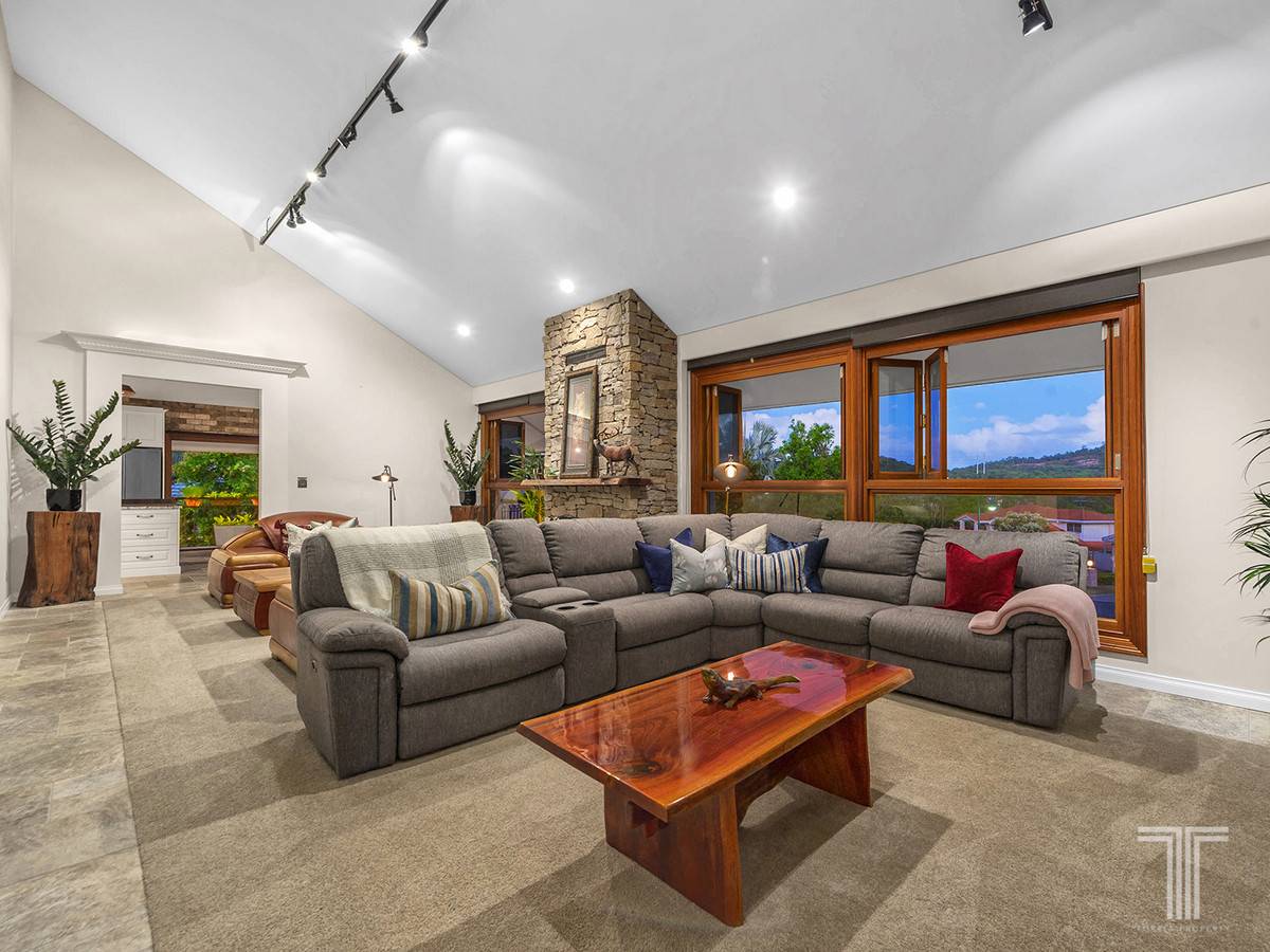 Destined to impress, the sprawling living room is filled with warmth and light. Composed of soaring slanted ceilings, Travertine floor tiles, striking fireplace and rows of timber framed windows to draw in picture-perfect views, you will be captivated from the moment you step inside.