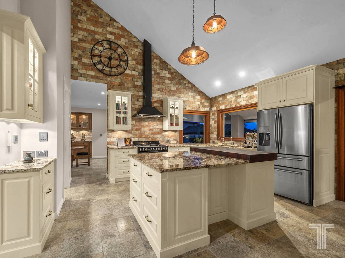 A true focal point of the home and finished to perfection, the exquisite European kitchen has had no detail overlooked. Designed by award-winning Dana Kitchens, this culinary haven is adorned with beautiful hand painted cabinetry, stylish brick-look wall tiles, walk-in butlers pantry, top of the range Smeg gas cooktop with double oven, built-in jarrah cutting board and stunning granite benchtops with centre island bench. Complete with a light filled dining area framed by rows of bi-fold doors leading onto an entertainers balcony with cooling north-easterly bay breezes, preparing and enjoying meals here will be a delight.