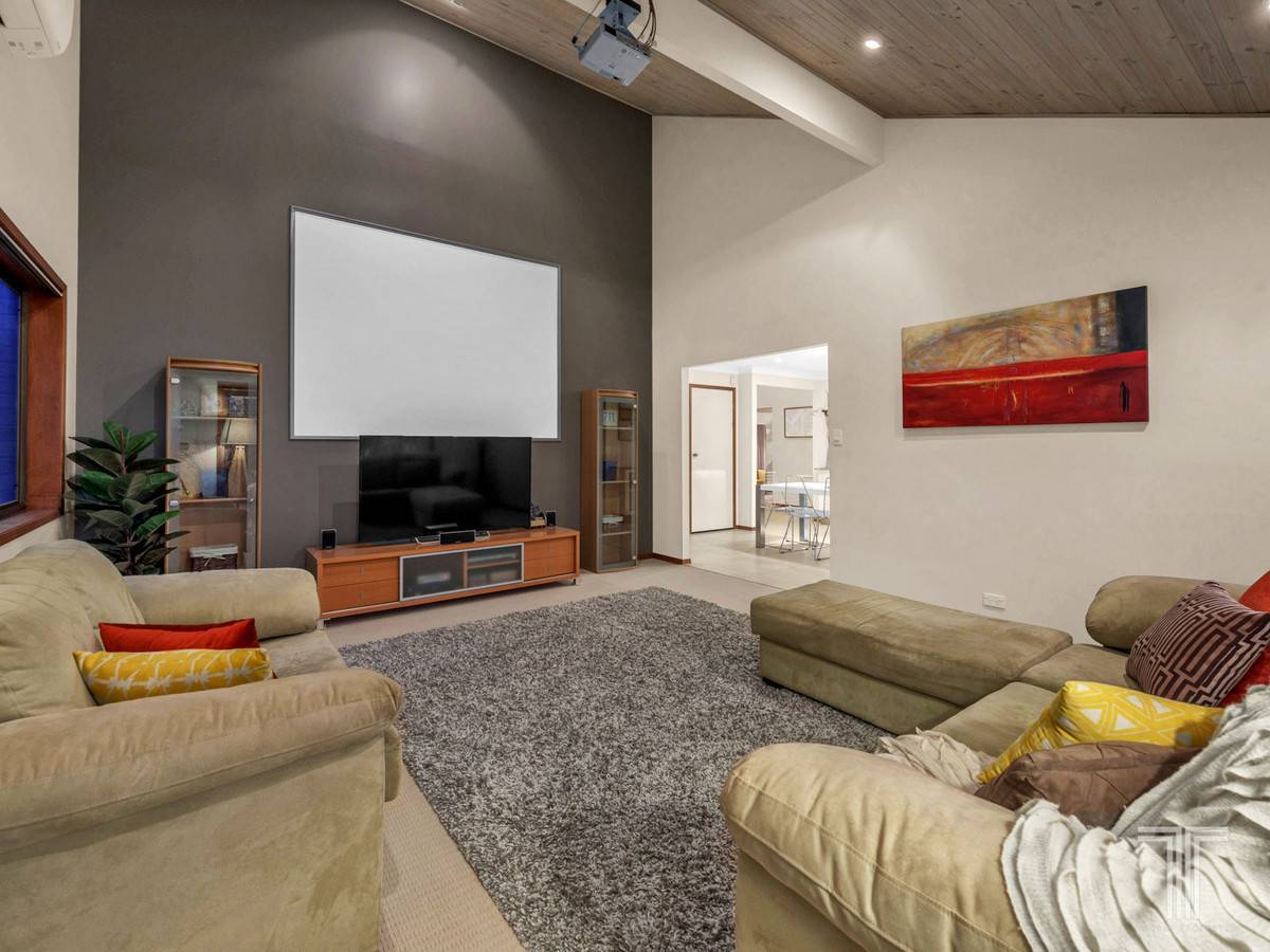 Presenting further living space, the media room is the ultimate home theatre with Scandinavian-style lime-washed natural pine ceilings, projector and screen.