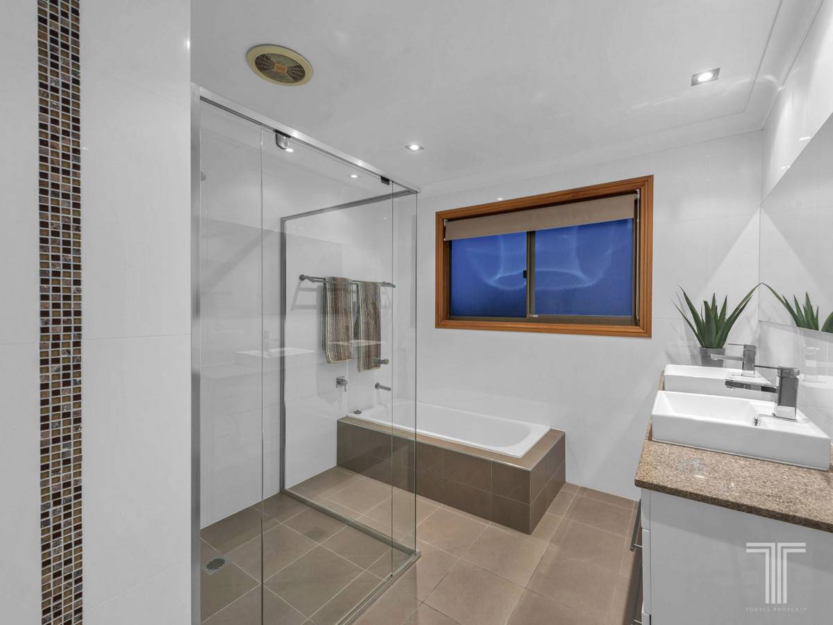 Upstairs, four bedrooms offer ideal separation from the living zone below. Well-sized, the master bedroom includes a walk-in robe and ensuite, while the additional bedrooms all feature built-in robes and easy access to the main bathroom. Perfect for guests or grandparents, a fifth bedroom/study is located downstairs alongside a third bathroom.