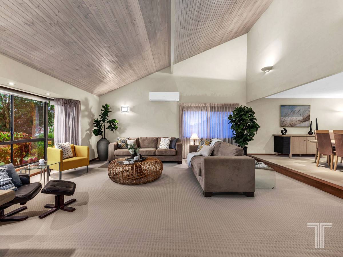Entering inside, you are immediately struck by the impressive and welcoming lounge room. Boasting soaring Scandinavian-style lime-washed natural pine slanted ceilings to create an incredible sense of space and openness, this relaxed and stylish living area adjoins the formal dining room and is filled with natural light.