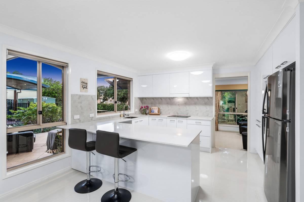 Adjoining the lounge and dining area is the centrally positioned kitchen. Renovated in 2018 and adorned with stone benchtops, breakfast bar and stainless steel appliances, this open-plan layout allows you to prepare meals while entertaining or supervising kids in the backyard and pool.
