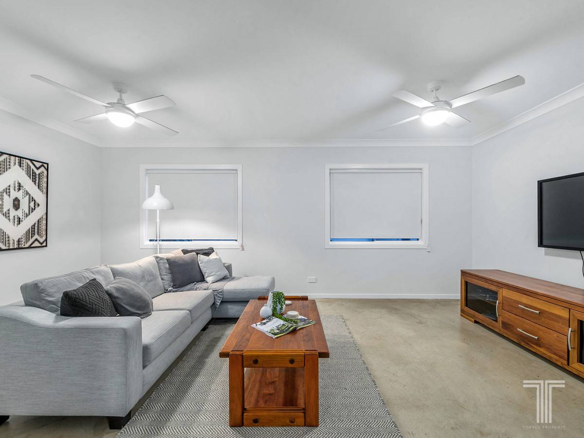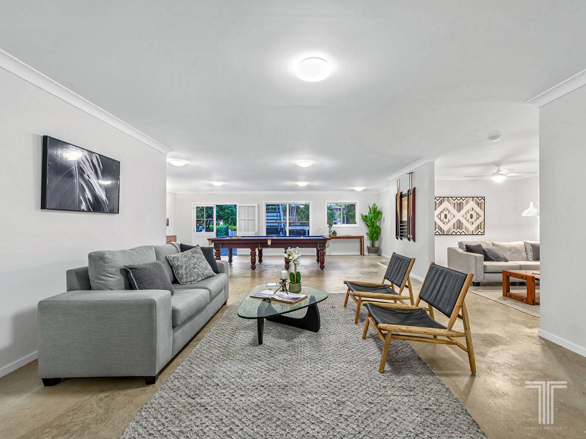 Across the lower level, a further two bedrooms with ceiling fans and third bathroom accompany an expansive rumpus, games room and media room. Adorned with polished concrete flooring and high ceilings this retreat is ideal for those seeking their own space and opens via French doors to the rear gardens and swimming pool.