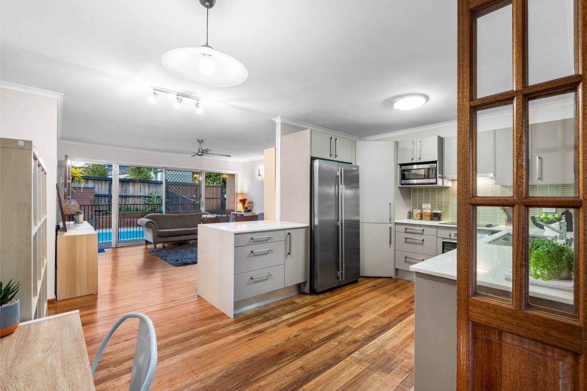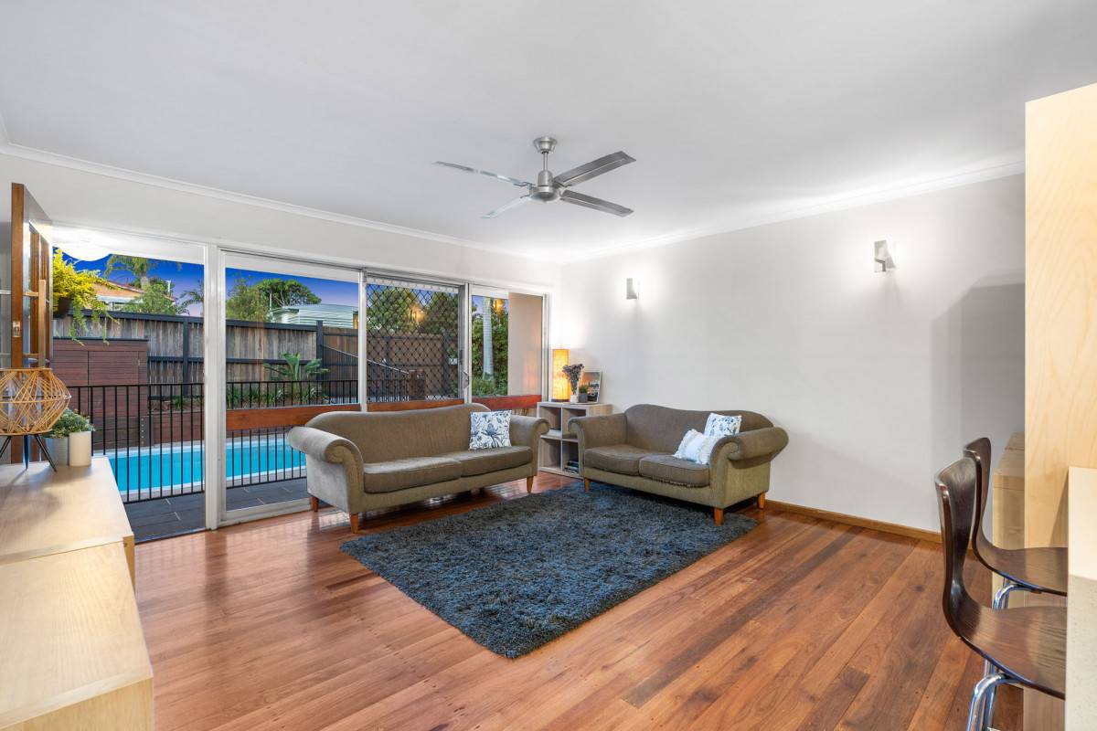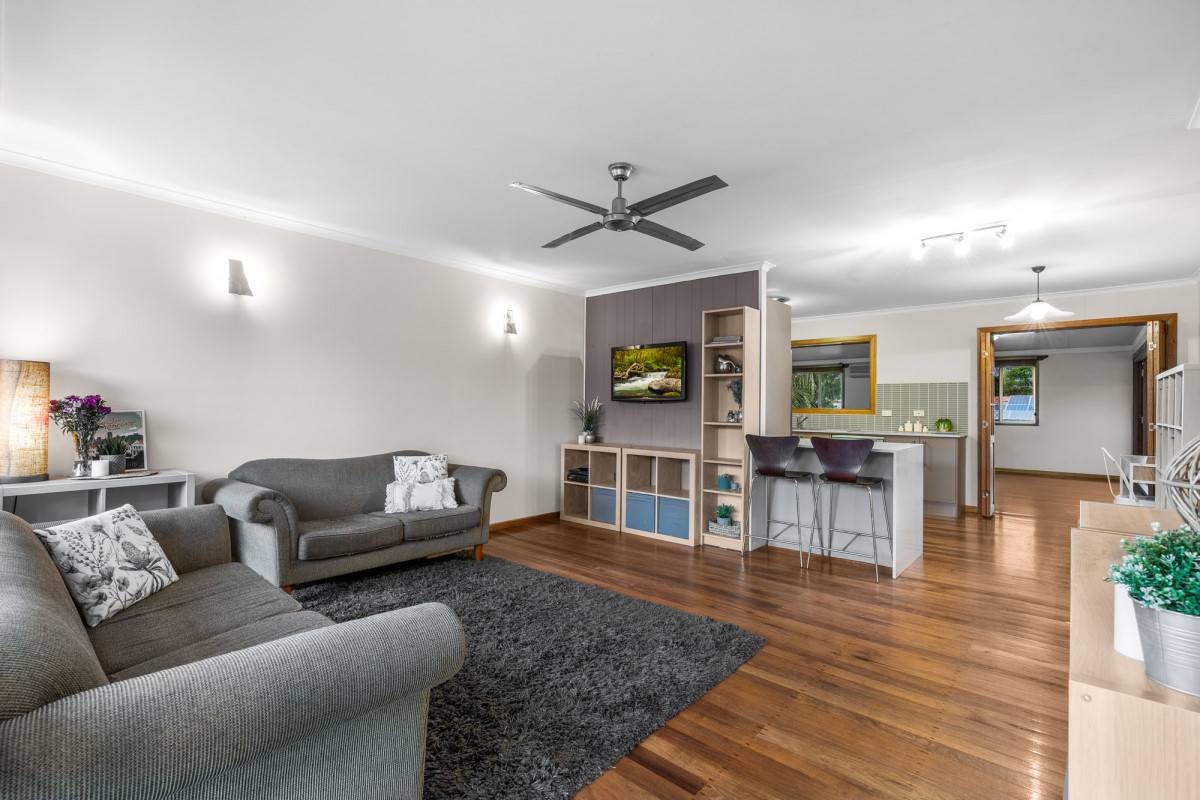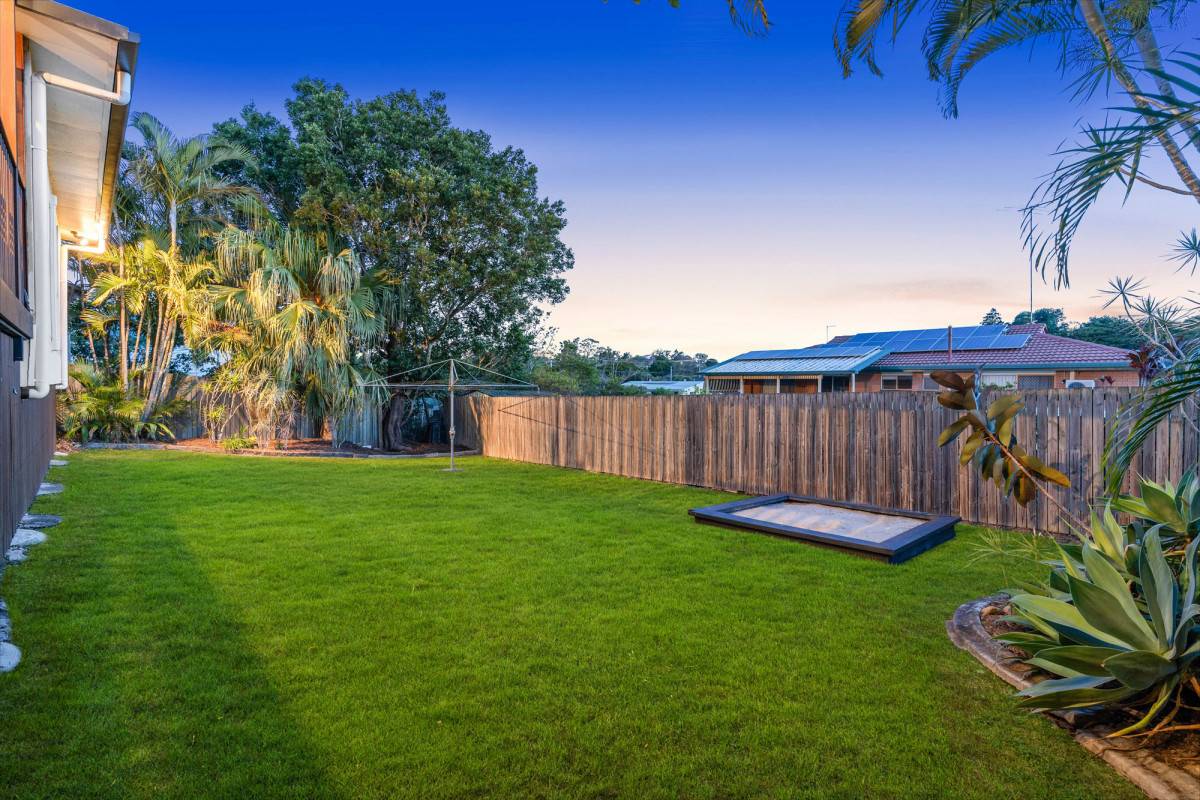 Open in design and the perfect place to relax and unwind the air-conditioned lounge and dining area features polished timber flooring and a wealth of natural light. Extending onto the rear entertainers deck via bi-fold doors this indoor/outdoor retreat overlooks the large grassy yard with palm trees and childrens sandpit.