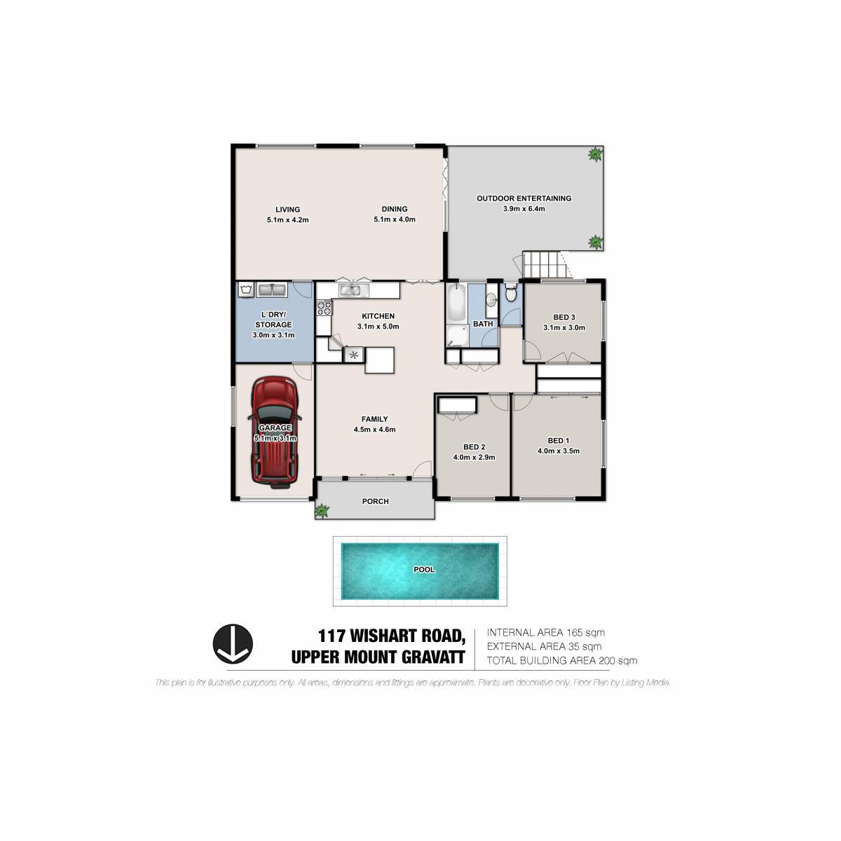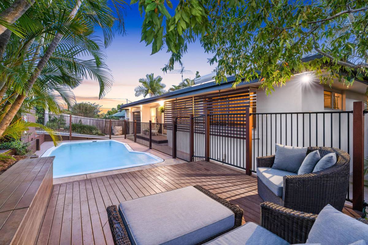 Presenting roomy interiors enter the family room which delights in outlooks over the sparkling pool with built-in timber deck.