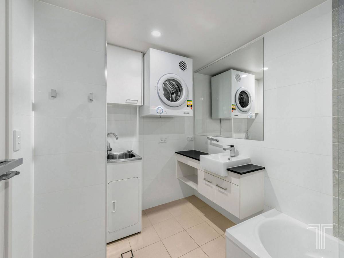 Hosting two bedrooms, both reveal beautiful bamboo flooring, air-conditioning and skyline views. While the master suite also delights in his and her walk-in robes and a stylish ensuite, a second bathroom with bathtub and internal laundry services the rest of the apartment.