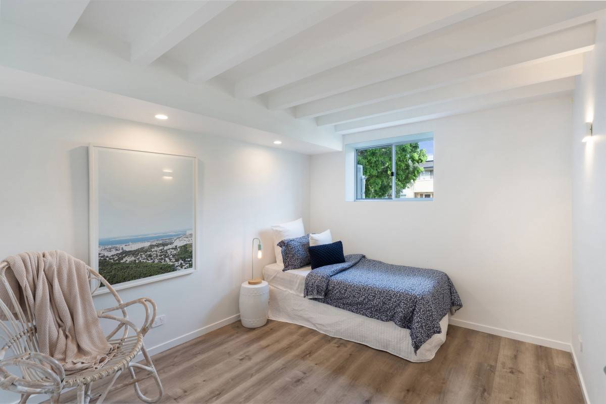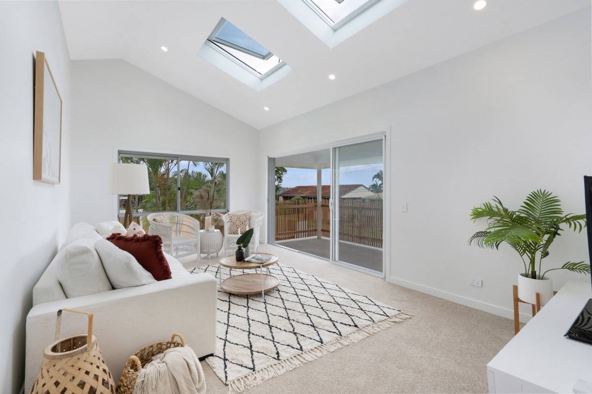 Across the upper level, a second lounge creates an idyllic indoor retreat. Featuring two Velux sky windows and extending onto the elevated balcony with expansive views of gateway bridge, port of Brisbane, city glimpses and pool, this relaxed living space is ideal for teenagers.