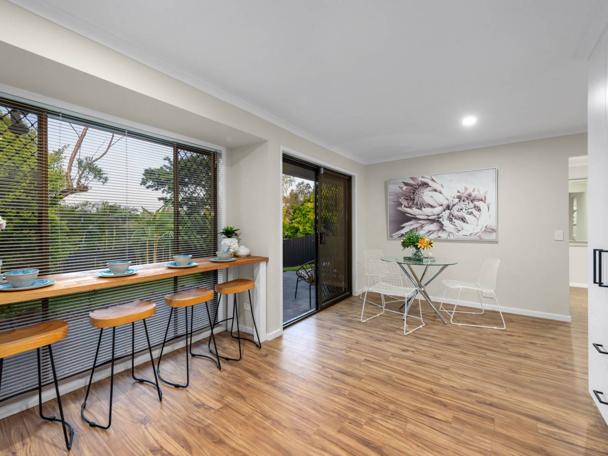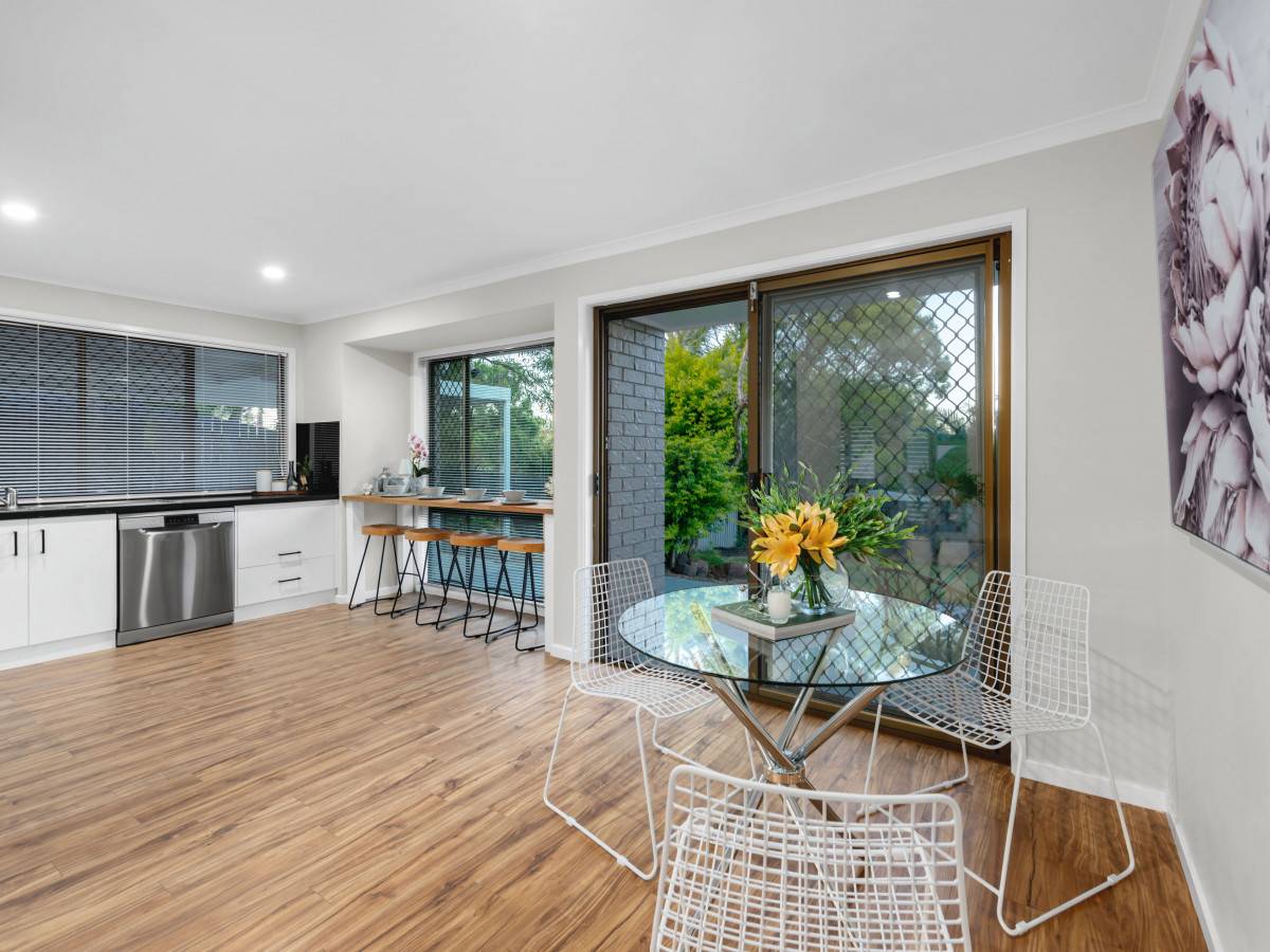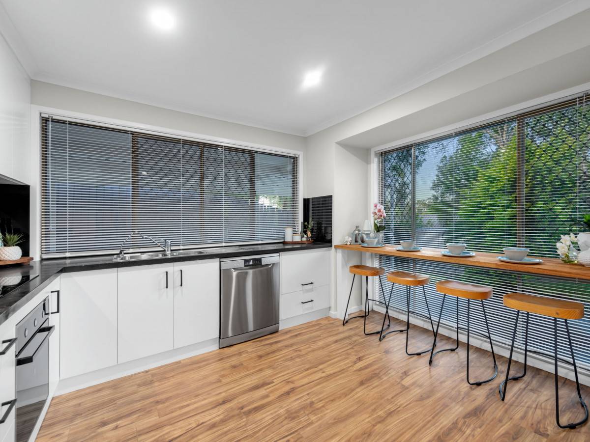 Boasting a custom-made design and featuring new appliances, hidden microwave, ample storage and a built-in timber breakfast bar, the kitchen draws in natural light and allows you to keep an eye on the children while they play in the backyard.