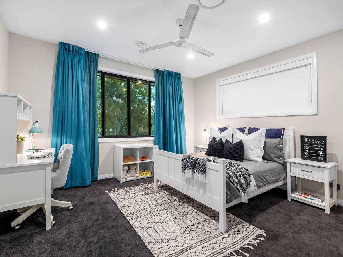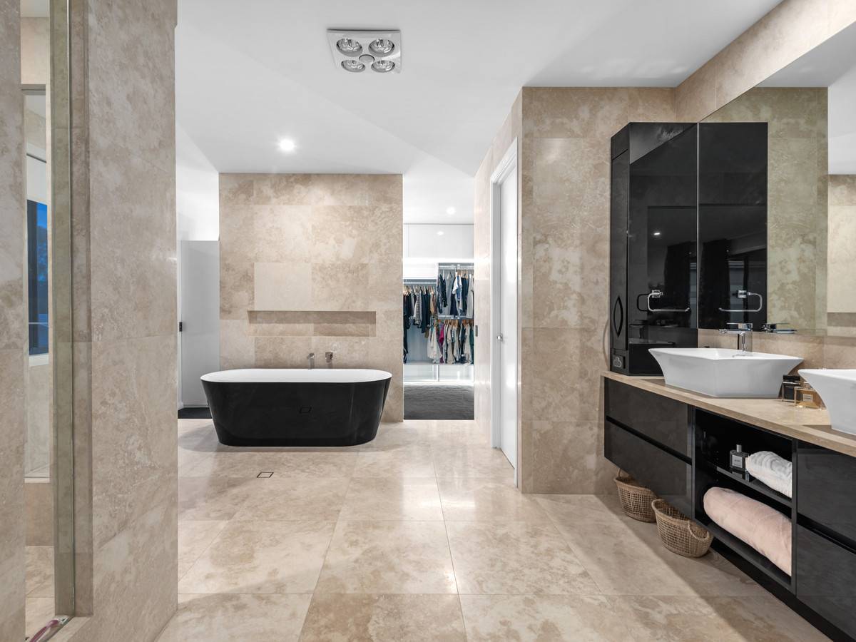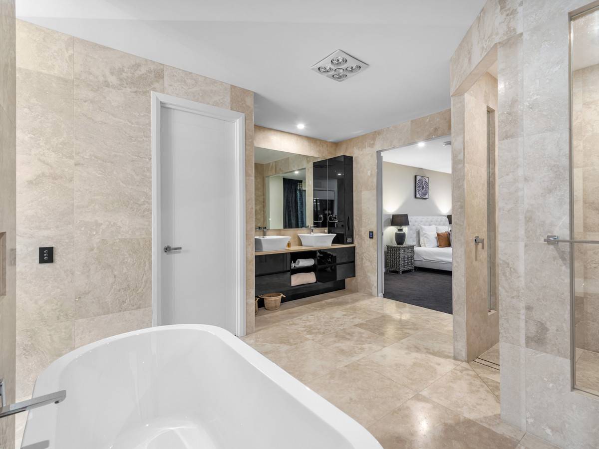 Encompassing a substantial portion of the propertys upper level is a lavish parents retreat with a beautiful canopy outlook. Making the master bedroom feel like a luxe haven is a very generous walk-in robe with a chandelier and plentiful shelving. A superb ensuite completes the space, featuring a freestanding bath, frameless shower, stone benchtops and floor-to-ceiling marble tiling.