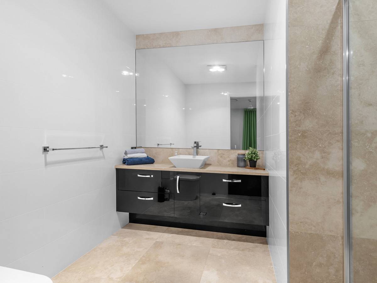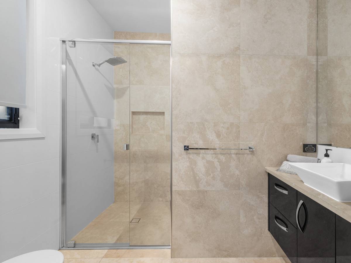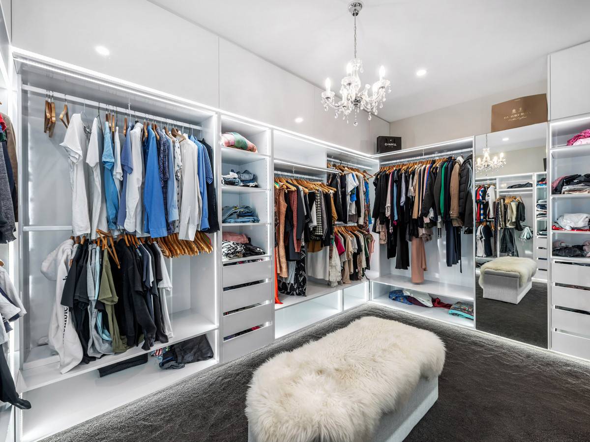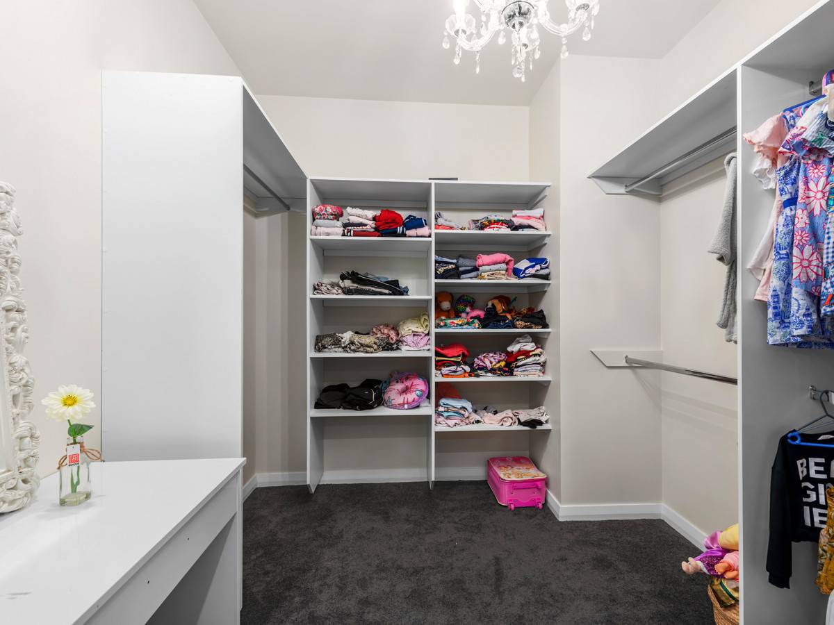 Encompassing a substantial portion of the propertys upper level is a lavish parents retreat with a beautiful canopy outlook. Making the master bedroom feel like a luxe haven is a very generous walk-in robe with a chandelier and plentiful shelving. A superb ensuite completes the space, featuring a freestanding bath, frameless shower, stone benchtops and floor-to-ceiling marble tiling.