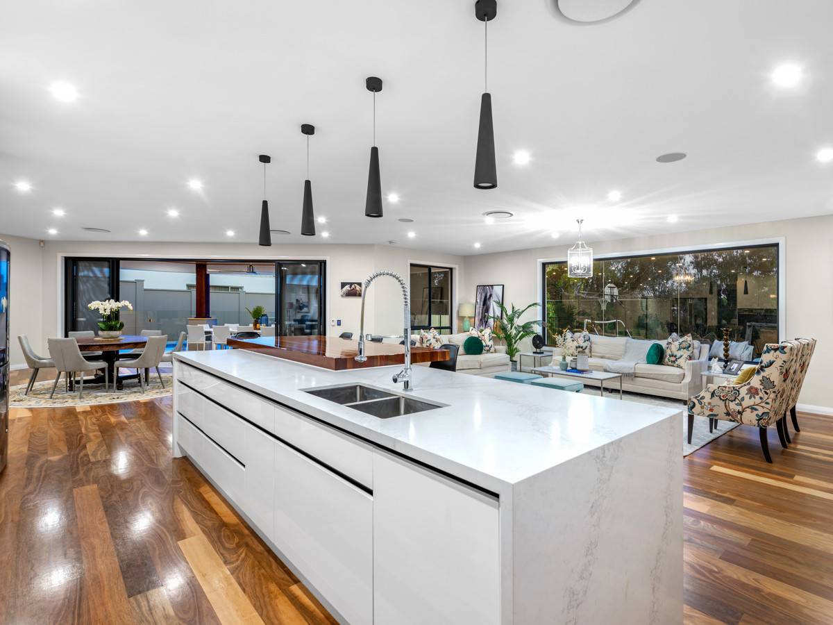 The highlight of this exquisite central living area is the stately gourmet kitchen. Complete with a large island counter, a timber breakfast bar, stone benchtops, dual ovens, a mirrored splashback, butlers pantry and vast amounts of benchspace, it has everything entertainers and cooks need to host a fabulous gathering.