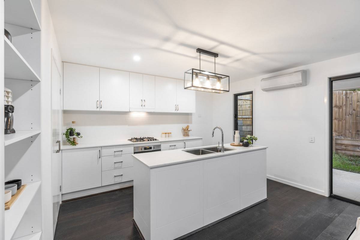 The gourmet kitchen adjoins the living area and features a sleek white design, gas cooktop, soft close drawers and industrial-style lighting