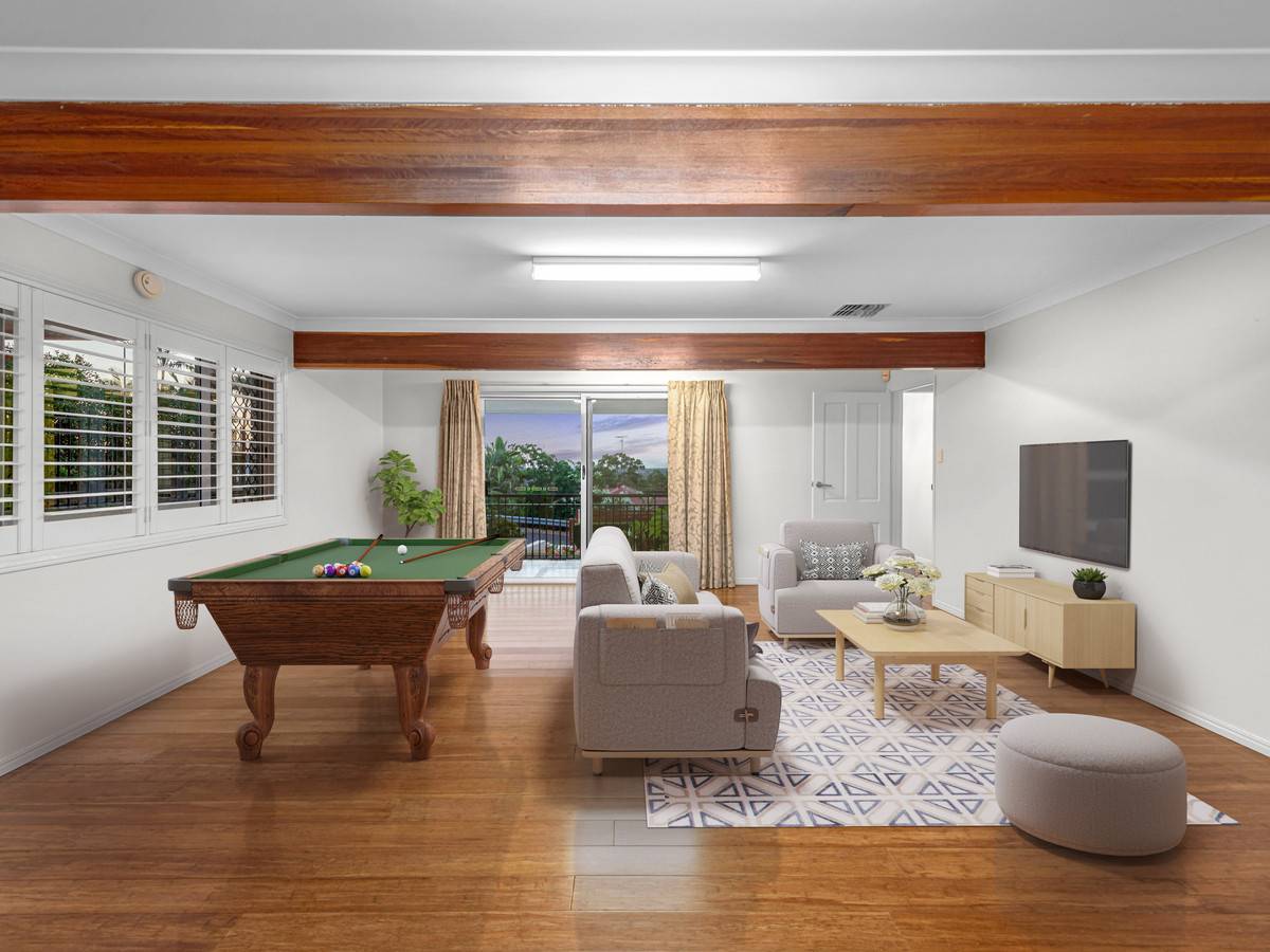 Presenting further living space, the rumpus room is generously sized and boasts exposed beam ceilings and access to the front and rear yards.