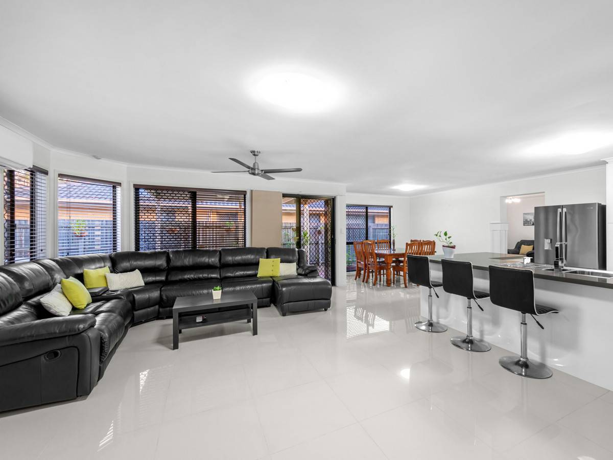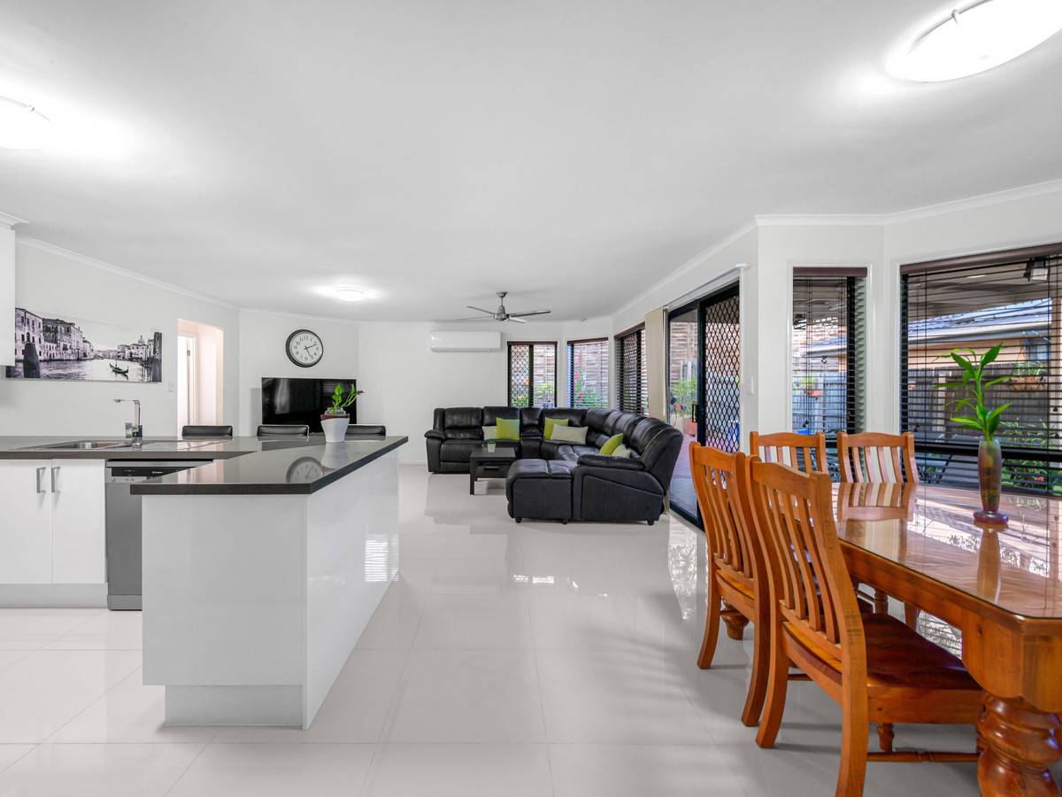 Entering inside, you are greeted by an inviting lounge room adorned with sleek floor tiles and a crisp white colour palette. Extending through with ease to the open plan family and dining area, this air-conditioned living space adjoins the modern kitchen adorned with stone benchtops, rows of cabinetry and stainless steel appliances.