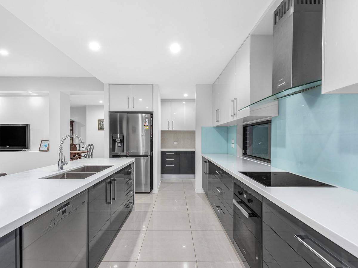 A free-flowing space perfect for everyday living, the family and dining area adjoins the gourmet kitchen boasting sleek stone benchtops, high-end appliances, rows of cabinetry and a butler's pantry.