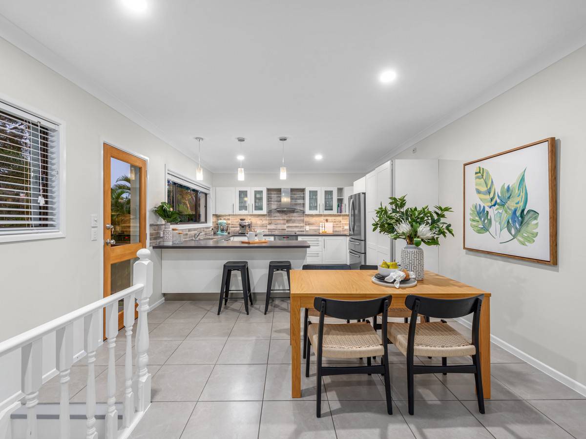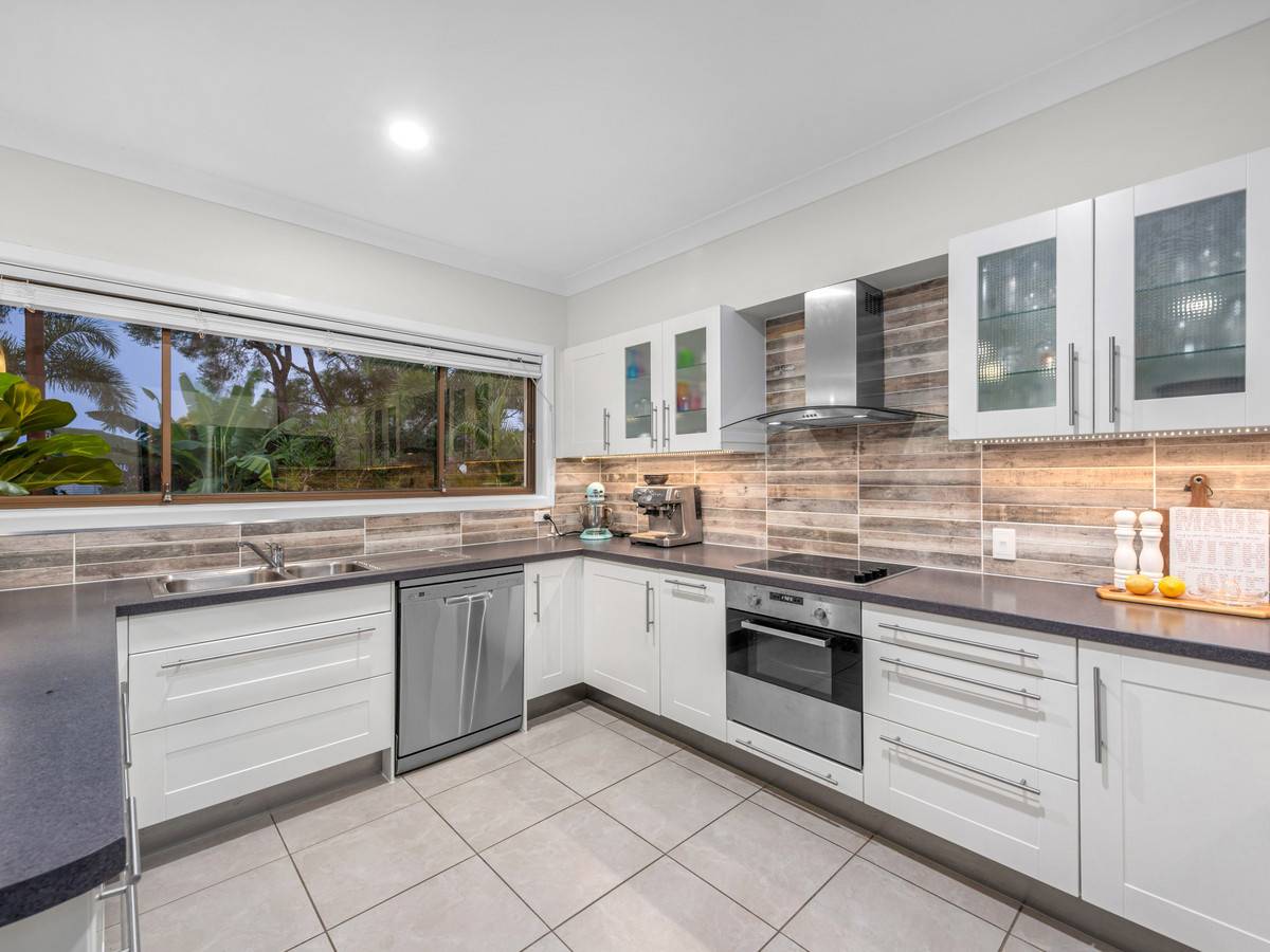 Flowing off the living room, the dining area features tiled flooring and adjoins the modern kitchen boasting stainless steel appliances and outlooks over the tropical gardens.