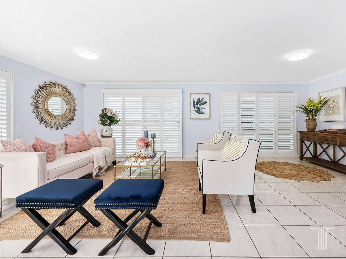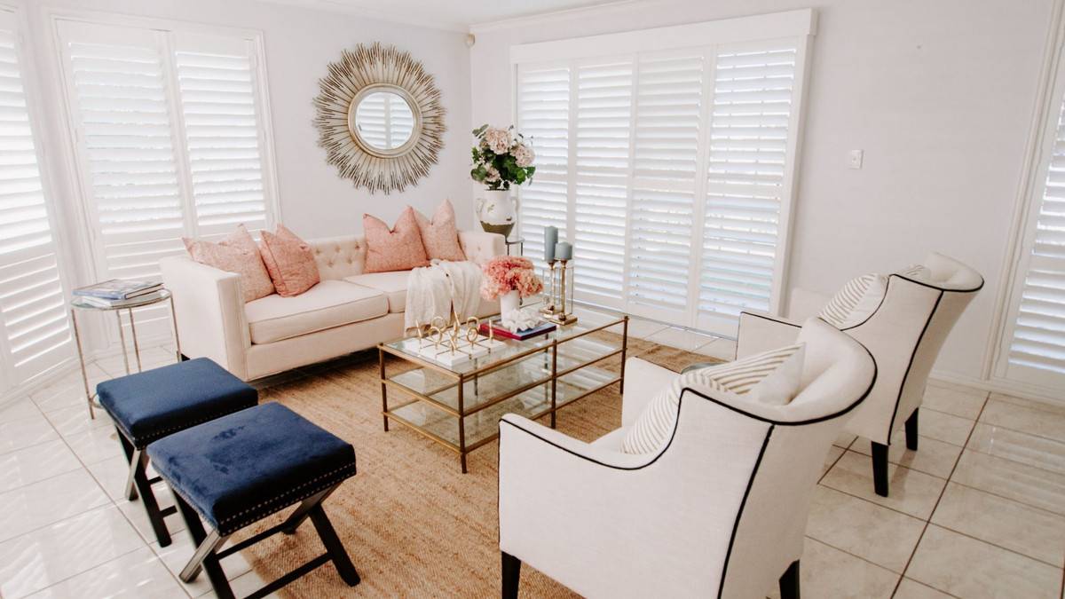Making your way into the lower level, the home reveals a formal lounge room. Bright and airy, this light-filled space is adorned with crisp white walls and stylish shutters to offer shade and privacy.
