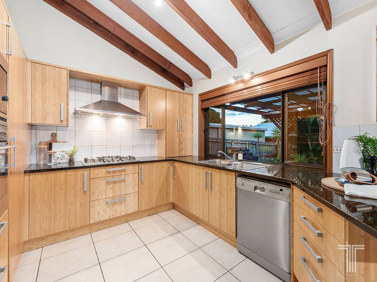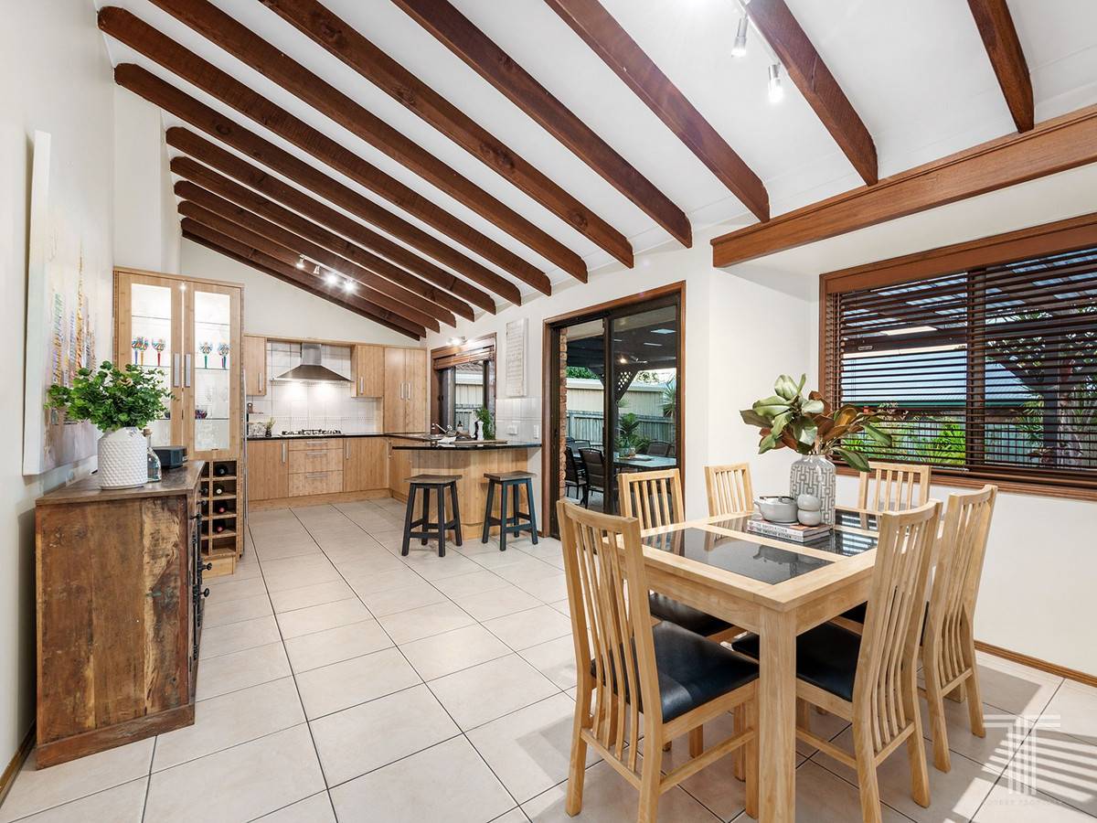 Making your way inside, you are greeted by a sprawling lounge and dining area. Adorned with timber-look flooring, high ceilings and exposed timber beams, this elegant retreat is perfect for everyday living and formal entertaining.