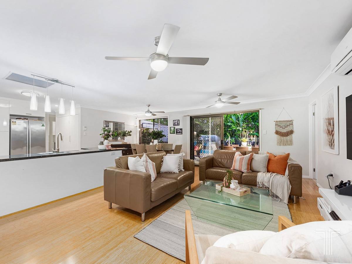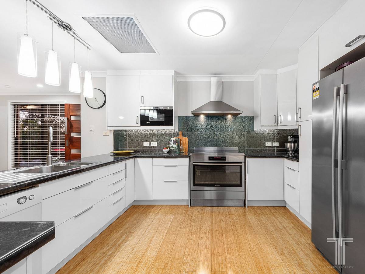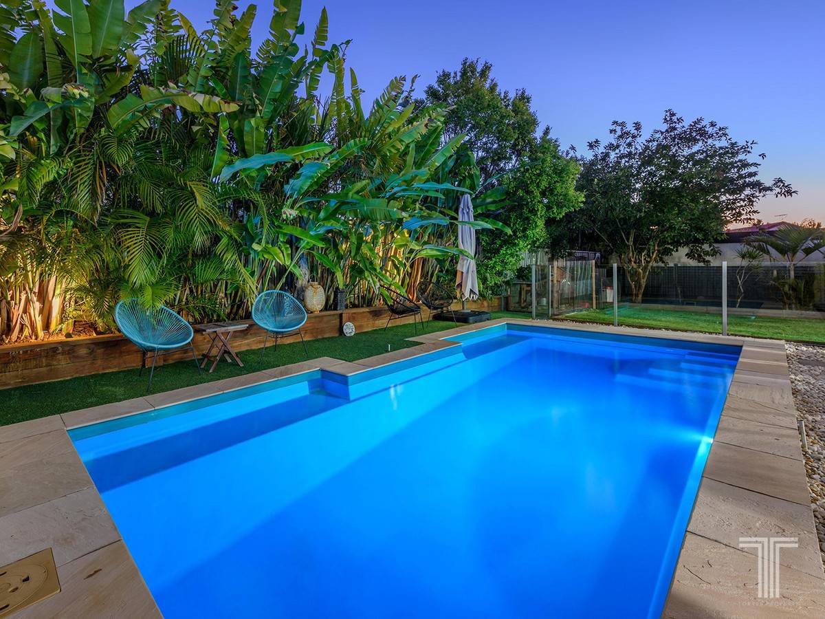 Set privately back from the street, a newly added entertaining area framed by lush gardens leads you inside into the light-filled lounge and dining area. Adorned with bamboo flooring, air-conditioning and harnessing outlooks across the pool, this generously sized and relaxed living space adjoins the modern kitchen showcasing ample bench space, a stainless steel oven and hanging pendant lights.