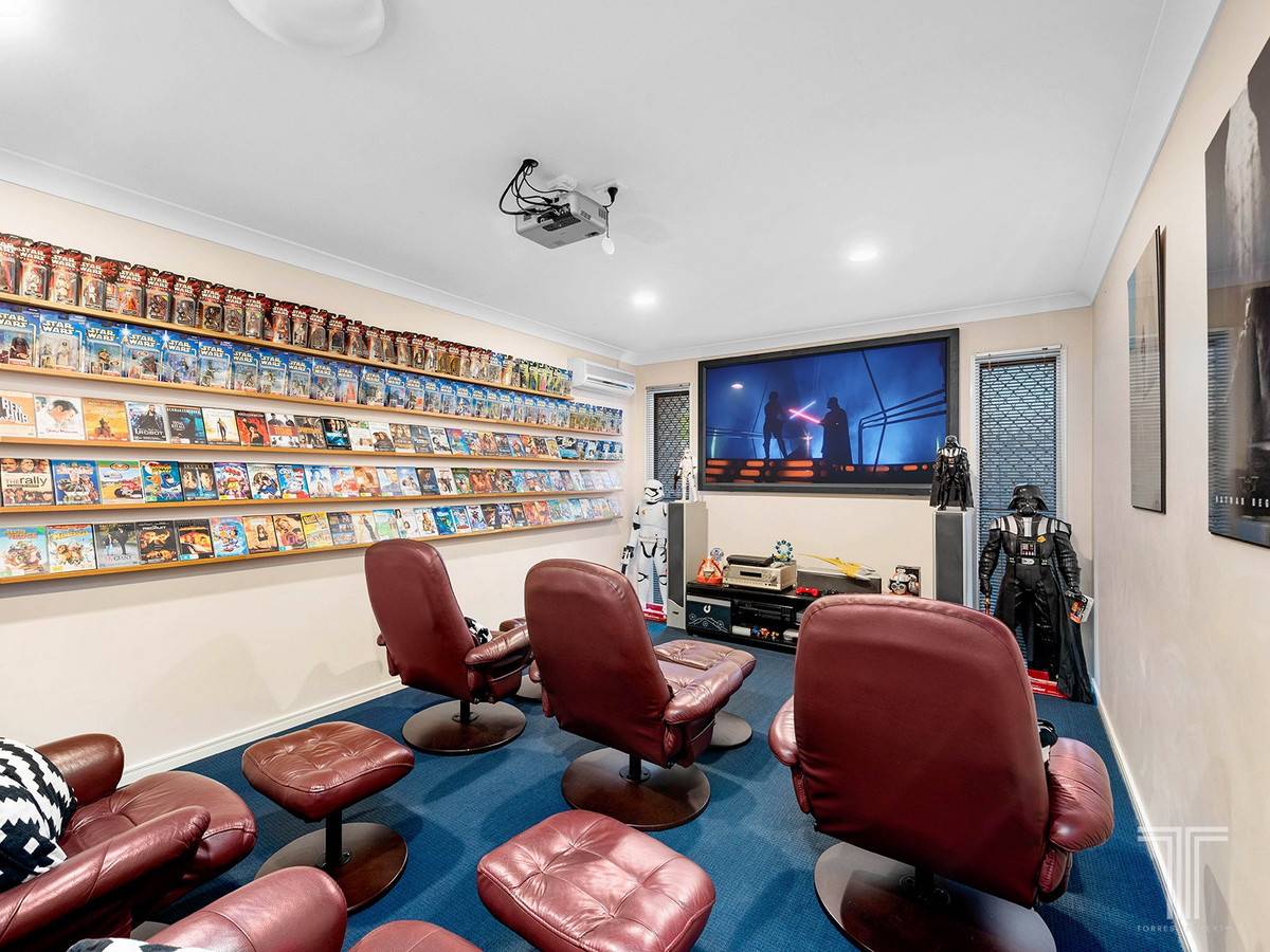 Providing further living space, a private media room with a projector and screen is destined for movie nights and weekend movie marathons.