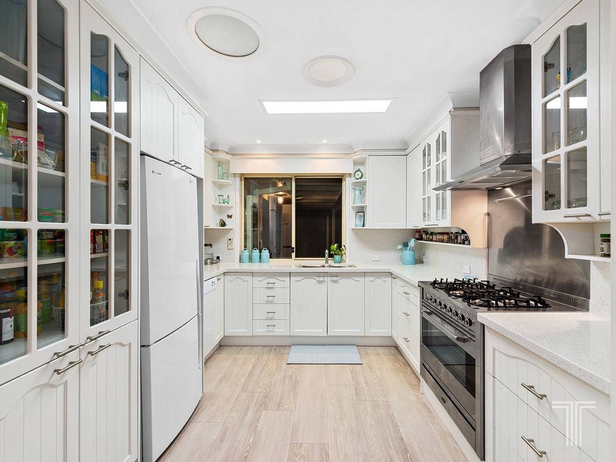 Entering inside, the open plan lounge and dining area will immediately impress with its gorgeous parquetry flooring and large windows and skylights. Adjoining this living space, the stylishly-appointed kitchen was inspired by the Hamptons and adorned with stone benchtops and a gourmet chef's oven.